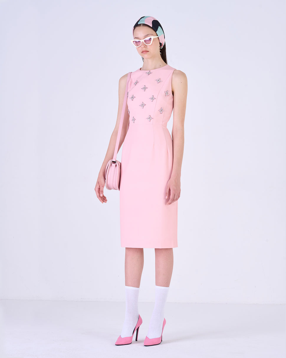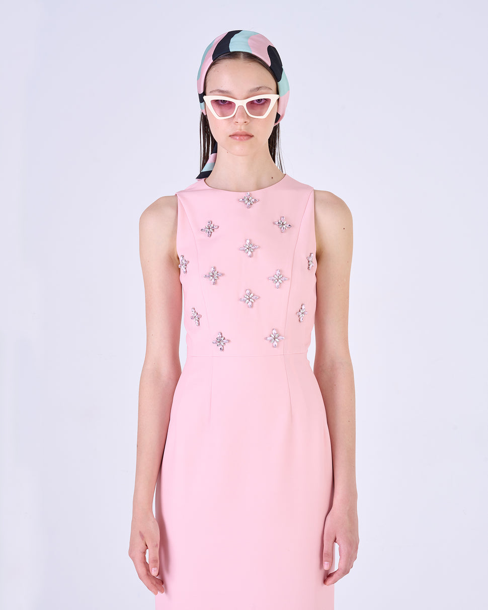 Abito midi con scollo rotondo, senza maniche. Dettaglio con applicazioni.