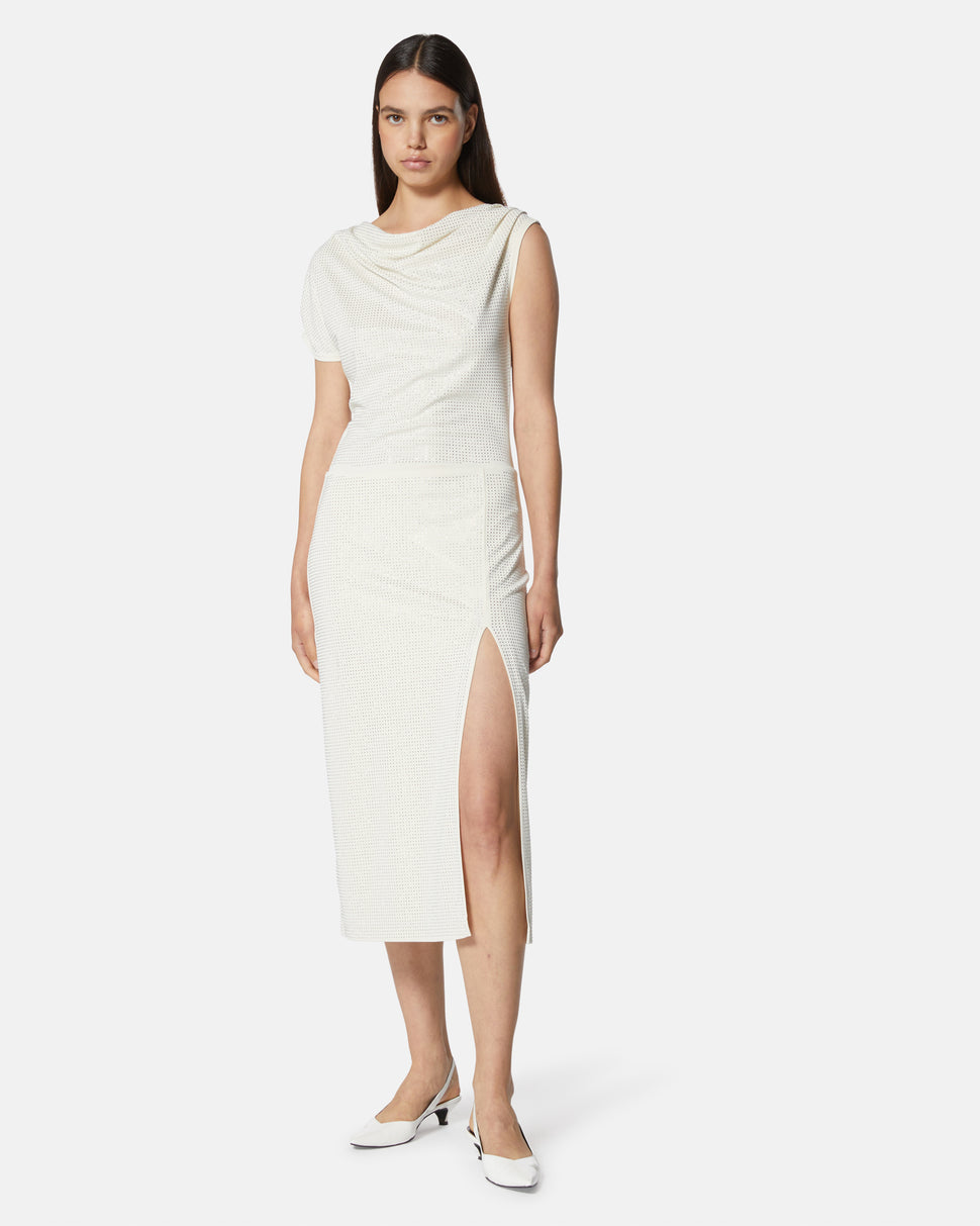 - Spacco laterale alto su gonna midi: aggiunge un tocco audace e femminile.