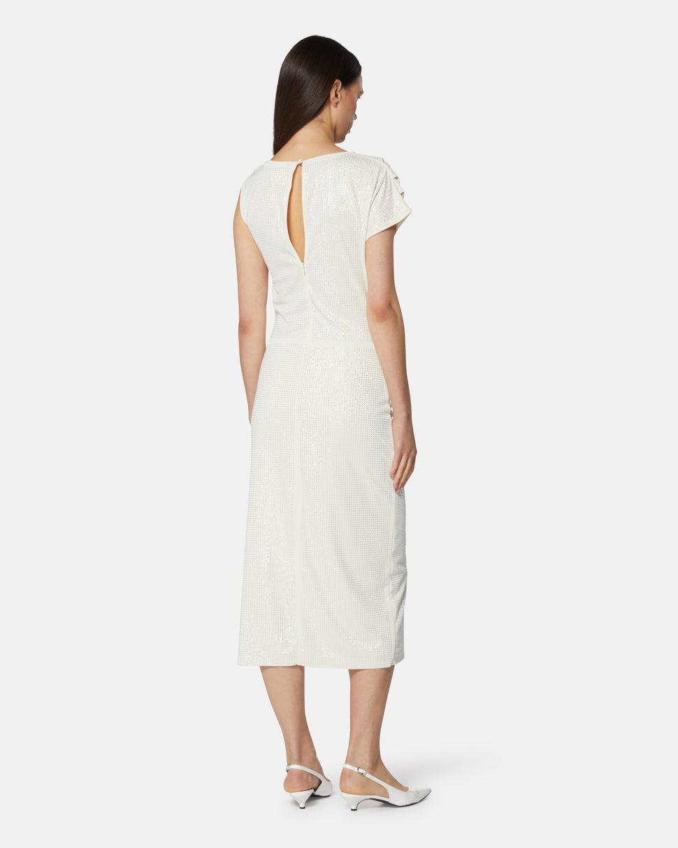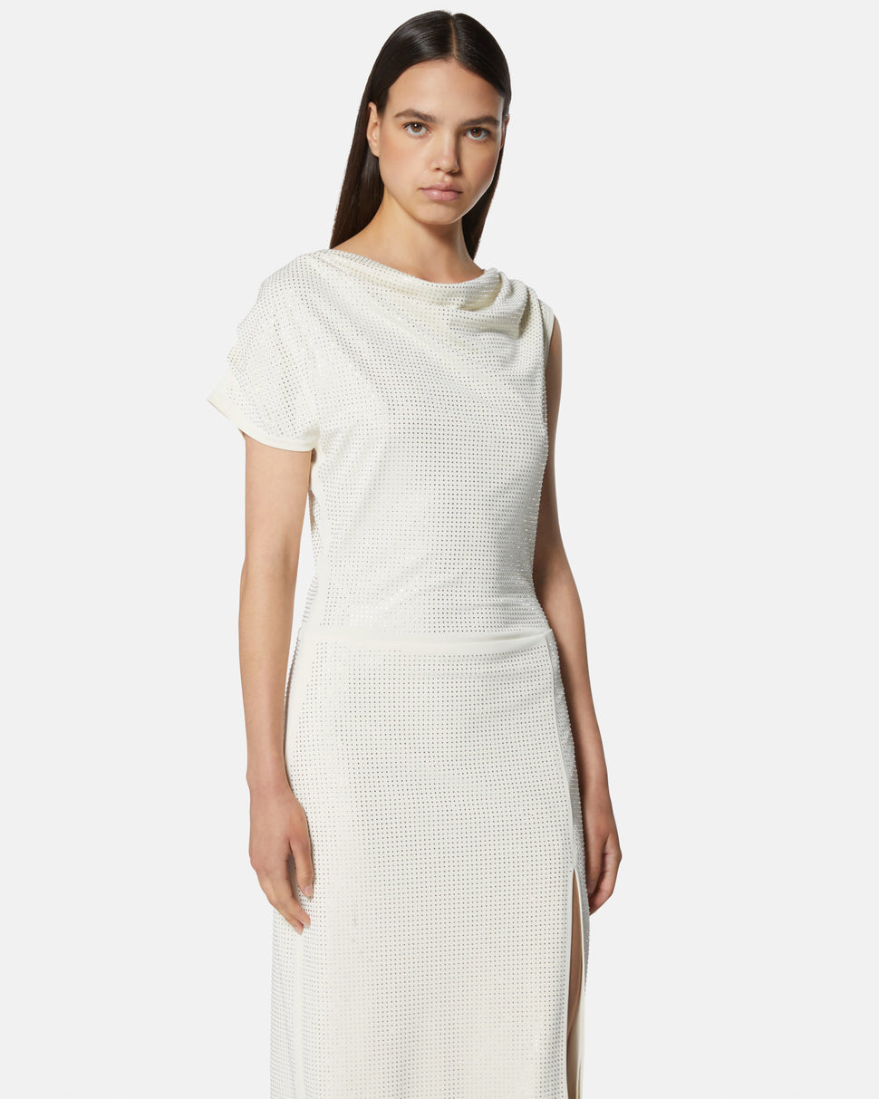 Un capo elegante e sensuale, realizzato in tessuto elasticizzato con micro applicazioni che donano un tocco di luminosità. Il design smanicato e le arricciature laterali esaltano la figura con raffinatezza.