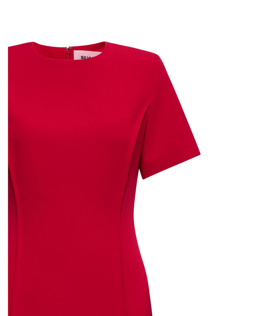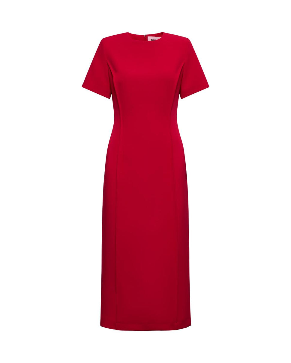 Essenziale e sofisticato, questo abito midi con maniche corte è pensato per outfit semplici ma di carattere. Il taglio dritto valorizza con discrezione la figura.