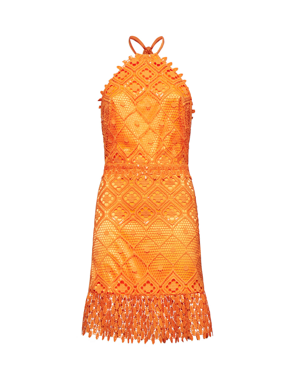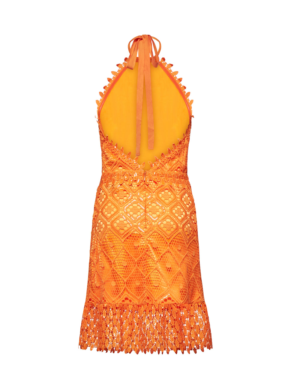 Un abito sofisticato e femminile, realizzato in pregiato pizzo crochet con dettagli traforati. Il design con scollo all'americana esalta la schiena e dona un tocco sensuale, mentre la lavorazione ricamata crea un effetto raffinato e boho-chic.