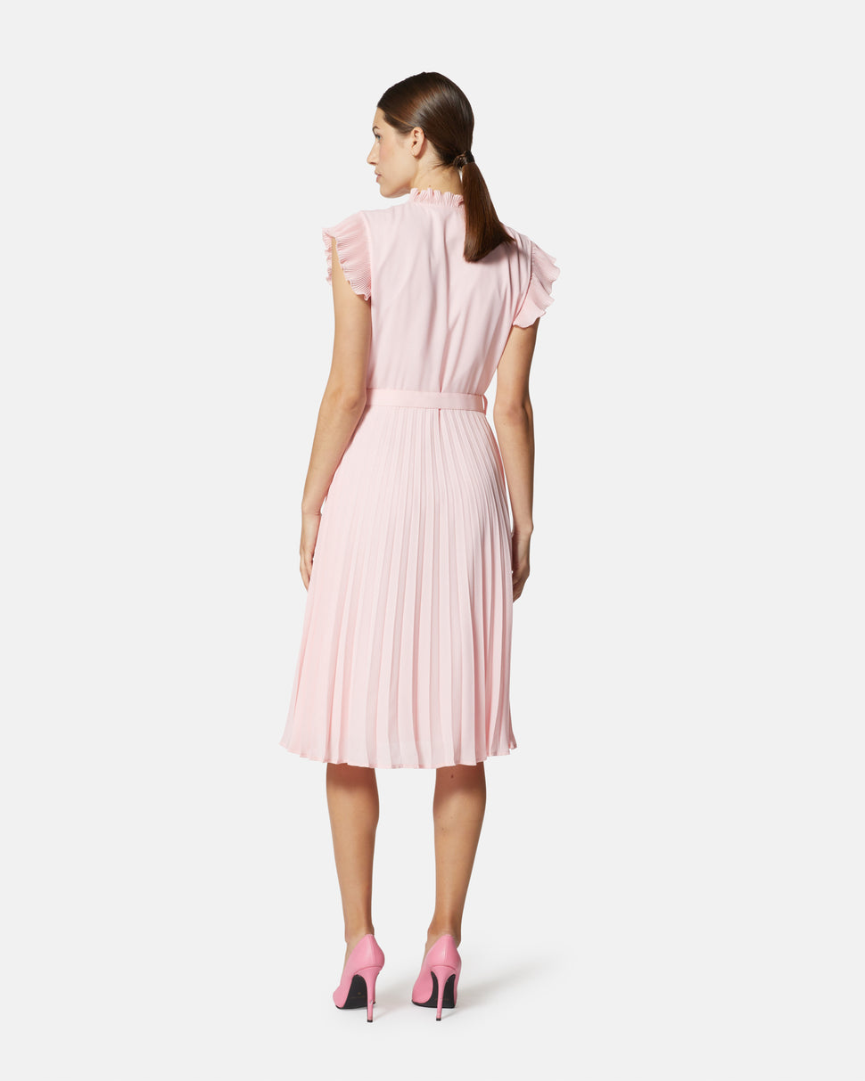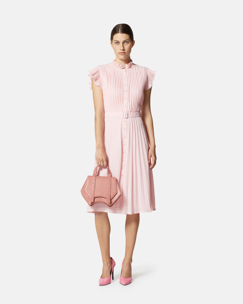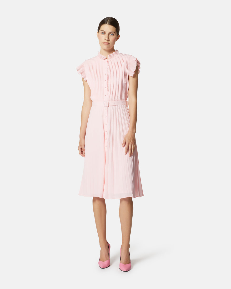 Un mix perfetto di eleganza e femminilità. Questo abito midi in cotone si caratterizza per il design raffinato con chiusura a bottoni frontale e delicati dettagli plissettati sulla gonna. Le maniche ad aletta con bordo ondulato aggiungono un tocco romantico, mentre la cintura in vita esalta la silhouette con grazia. Ideale per look sofisticati da giorno o eventi speciali.
