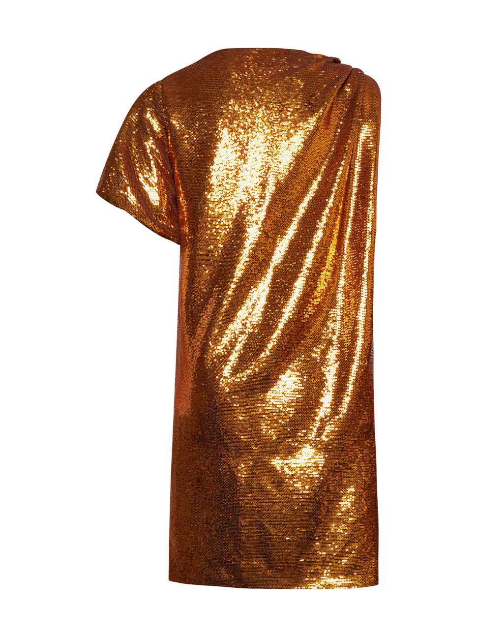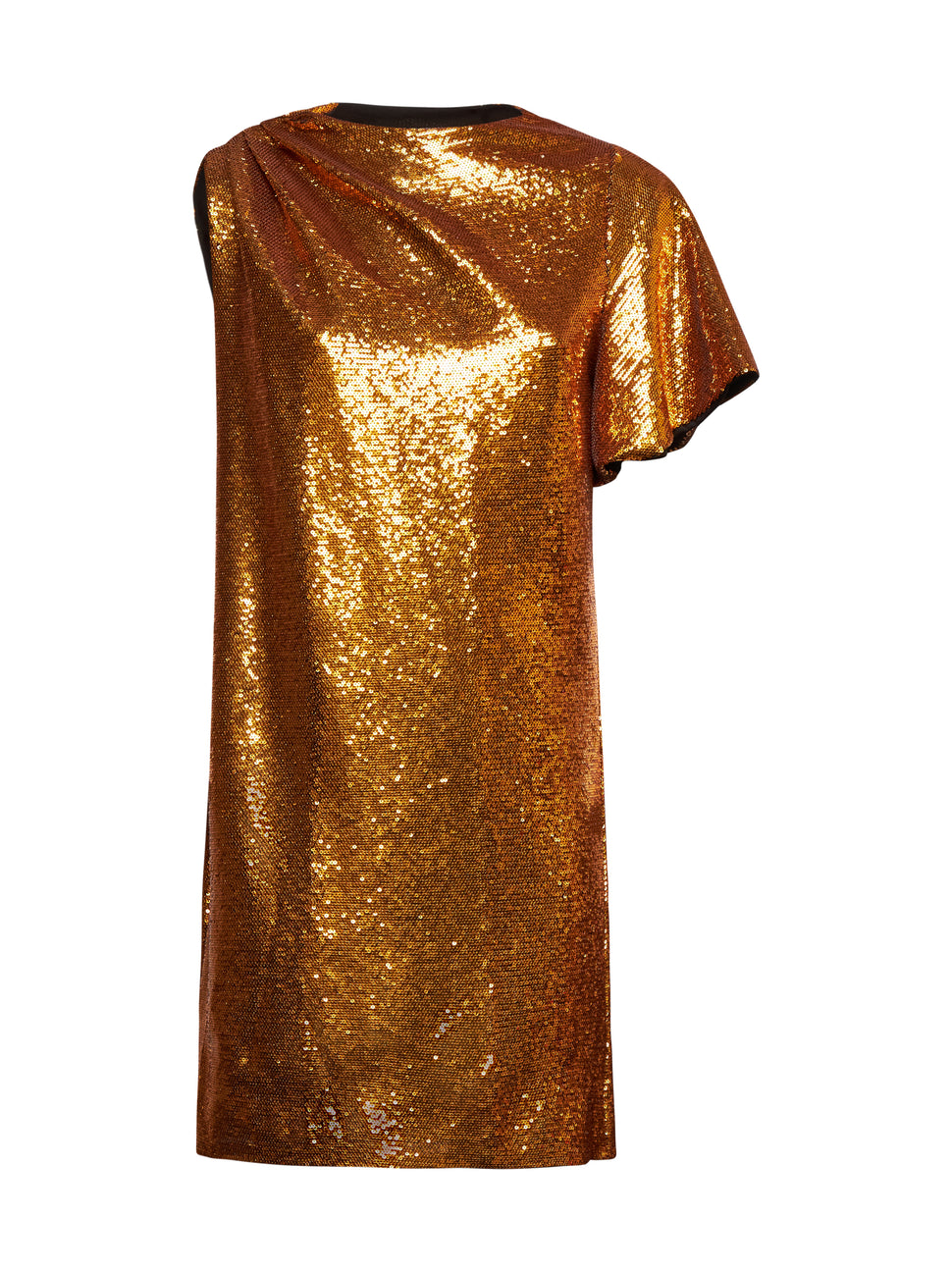 Un look luminoso e sofisticato perfetto per le occasioni speciali. Questo abito monospalla, interamente ricoperto di paillettes scintillanti, esalta la silhouette con un taglio elegante e una vestibilità dritta. La manica corta aggiunge equilibrio al design asimmetrico, creando un effetto moderno e raffinato.