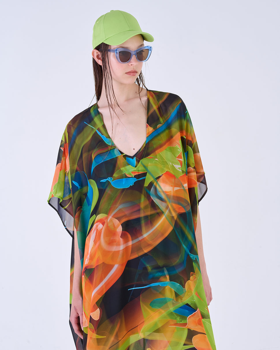 Abito semitrasparente a fantasia floreale. Maniche corte ad aletta e scollo a V. Linea over.