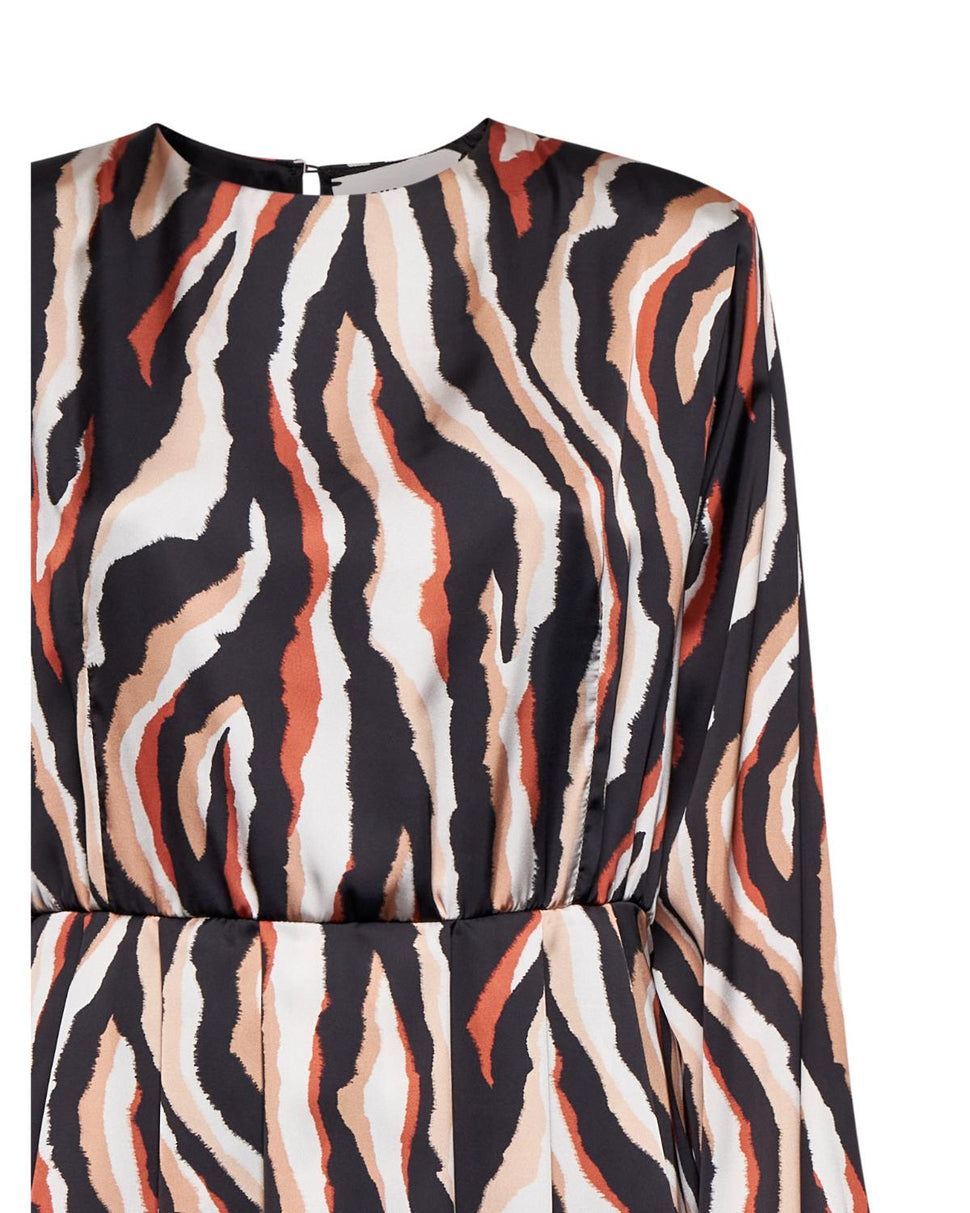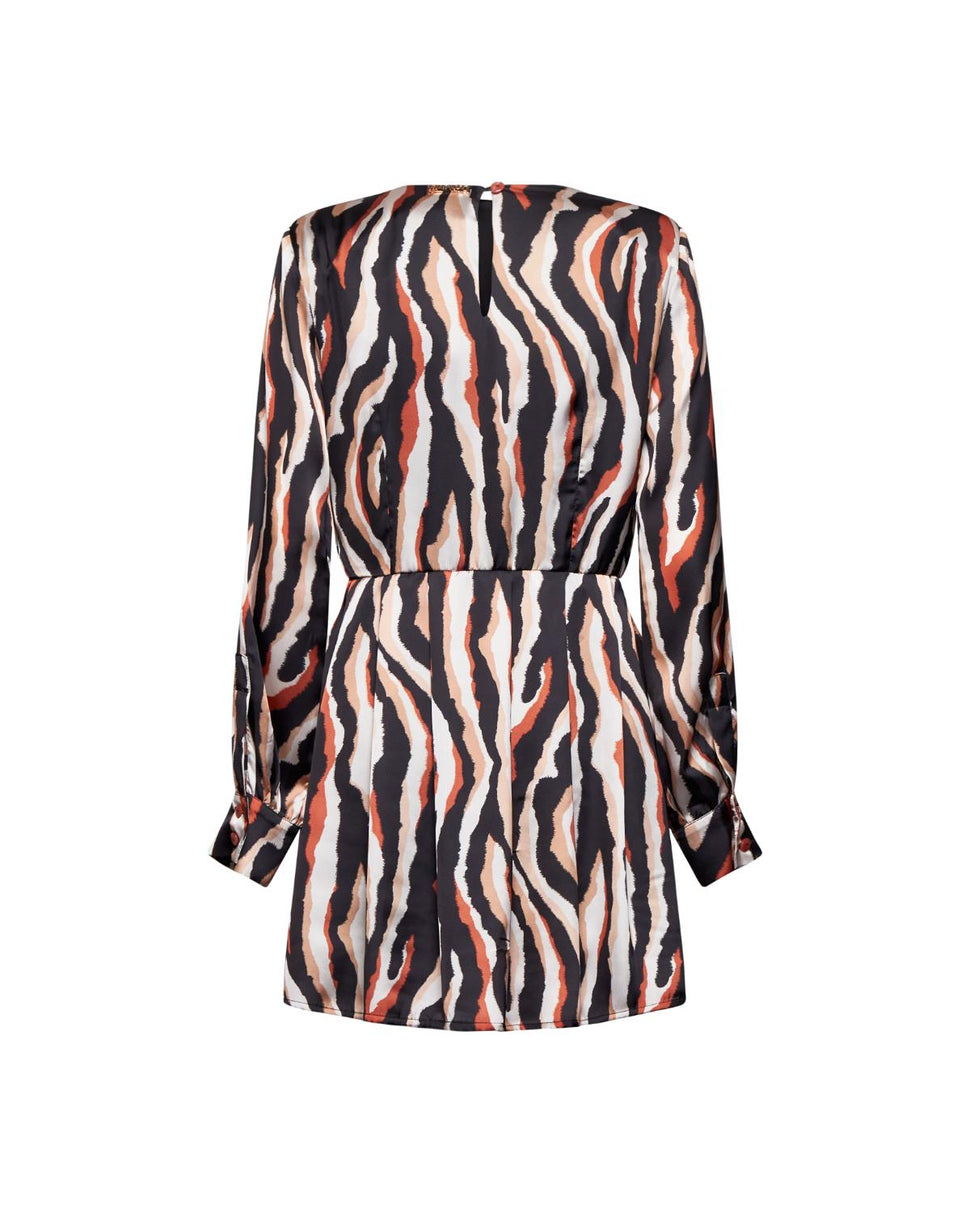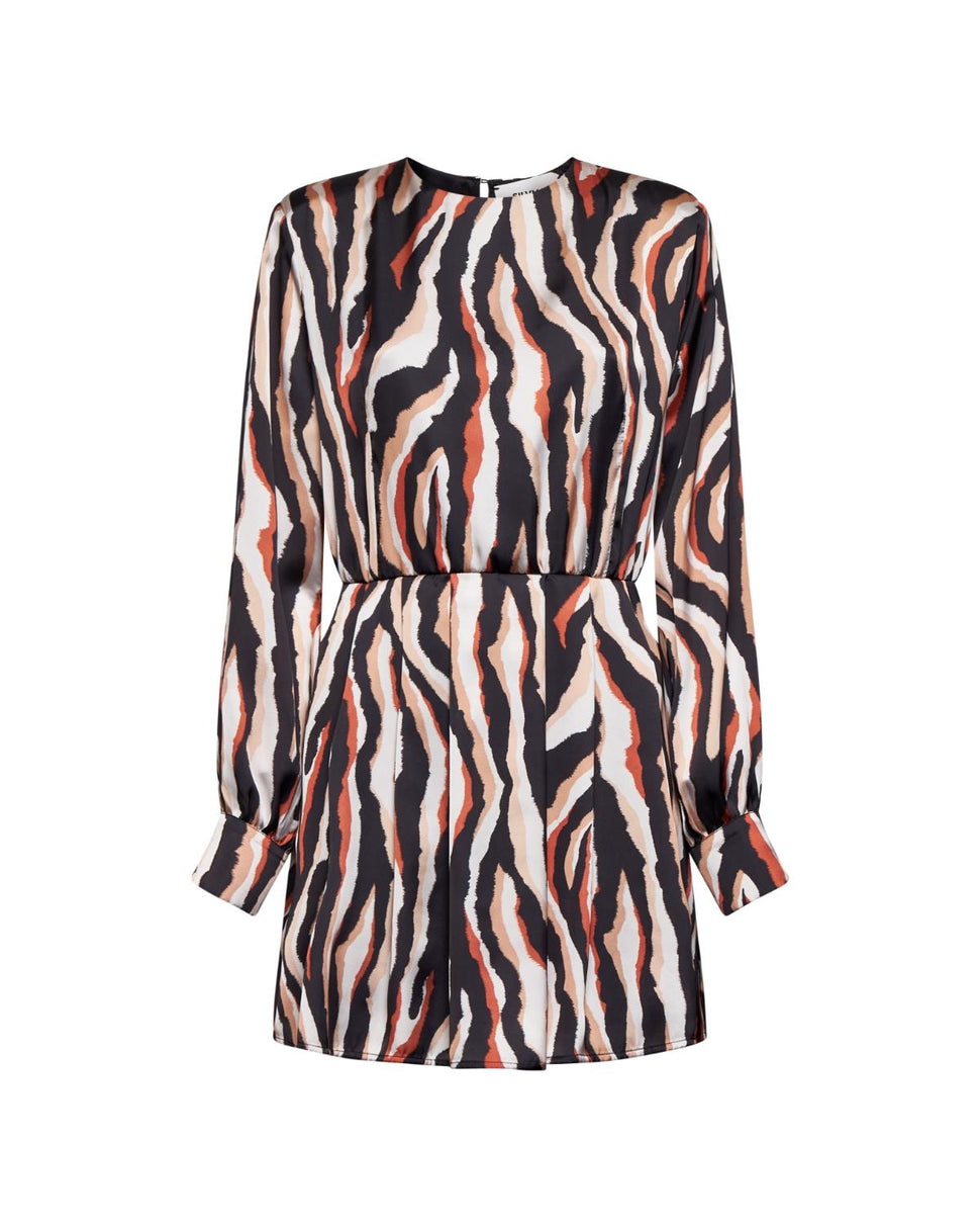 Un abito corto con stampa decisa e taglio morbido. L’elastico in vita definisce la silhouette, mentre le maniche lunghe lo rendono ideale per la stagione intermedia.