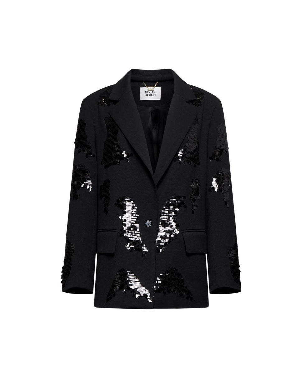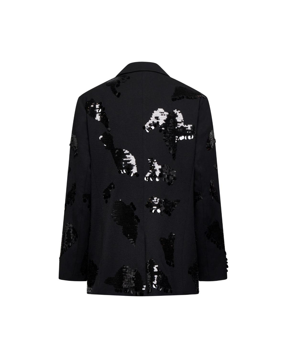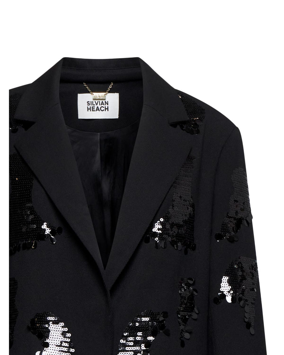 Giacca sartoriale con applicazioni materiche a contrasto che creano un pattern irregolare. Una texture d’impatto che rimane sofisticata.