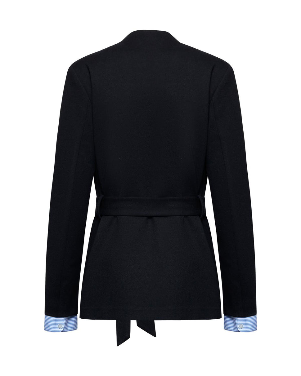 Versione aggiornata del blazer con cintura, arricchita da polsini a contrasto che svelano una fodera rigata. Un dettaglio inaspettato che rompe l’essenzialità.