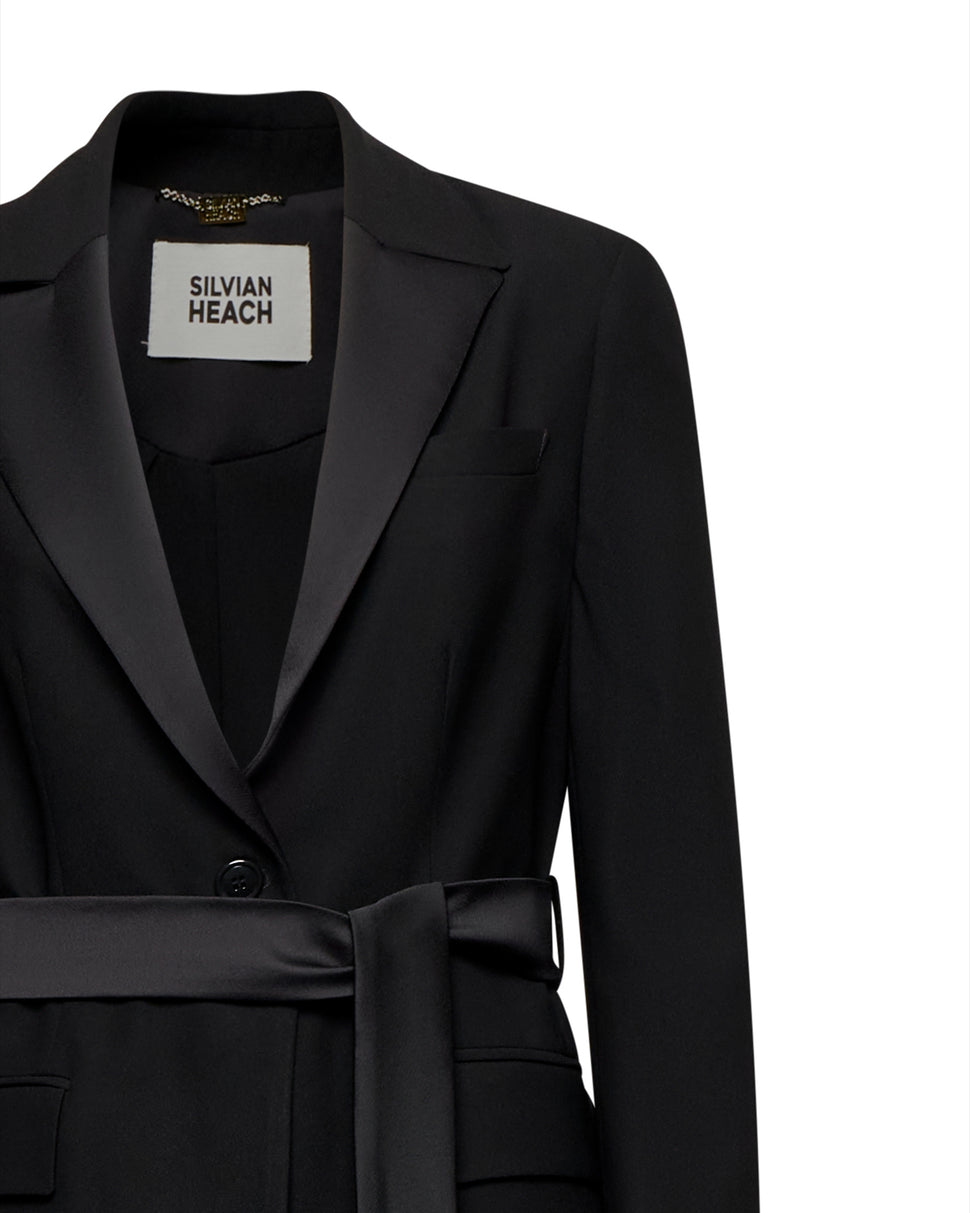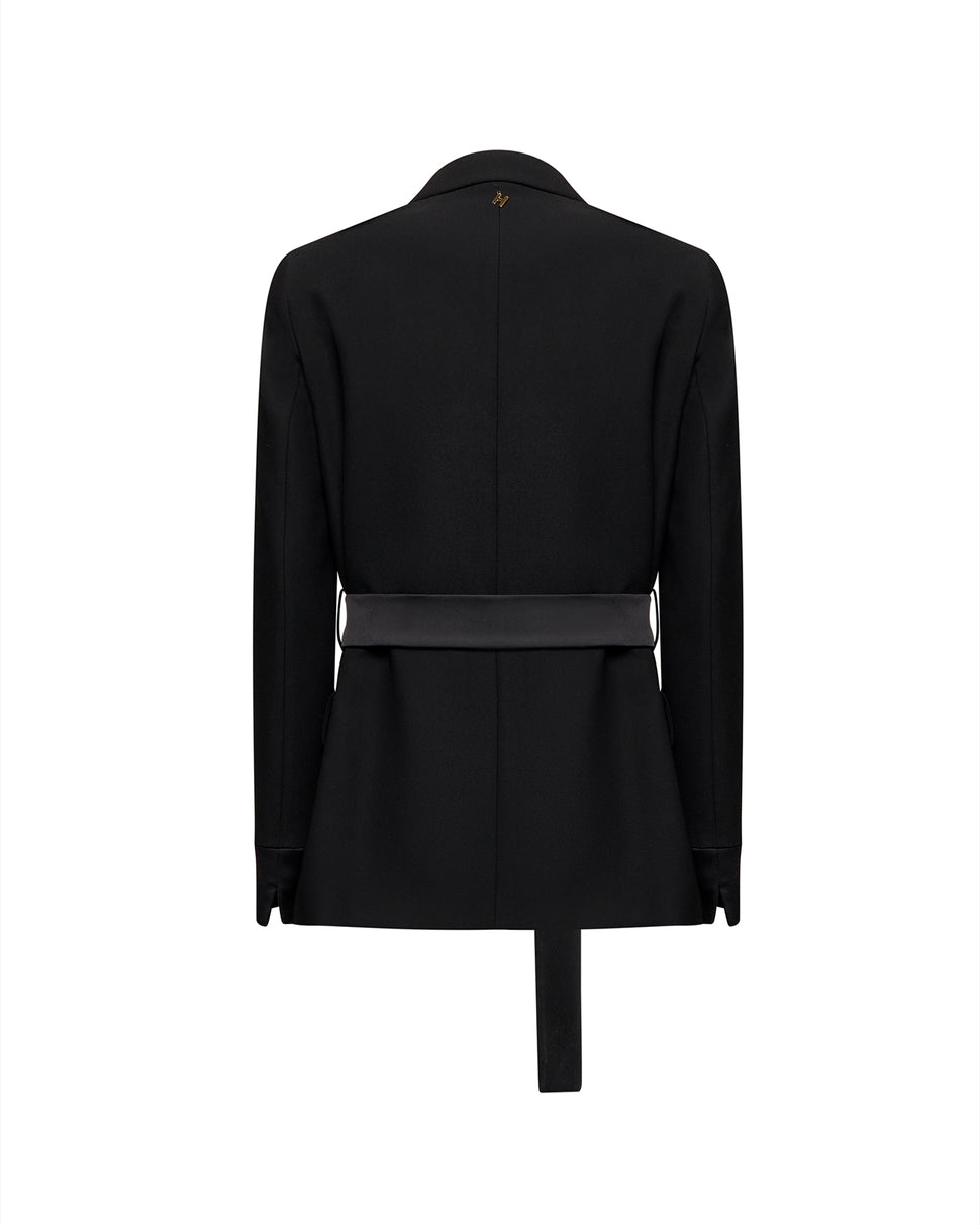 Blazer sartoriale con cintura annodata in vita. Il dettaglio ton sur ton sottolinea il punto vita e aggiunge definizione alla silhouette.