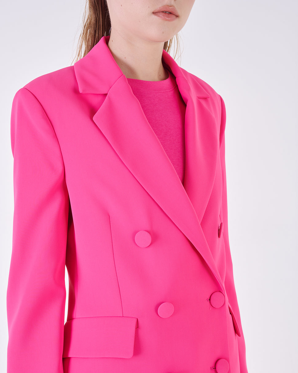 Blazer doppiopetto avvitato. Revers a punta con bottoni tone sur tone e tasche laterali con patta.