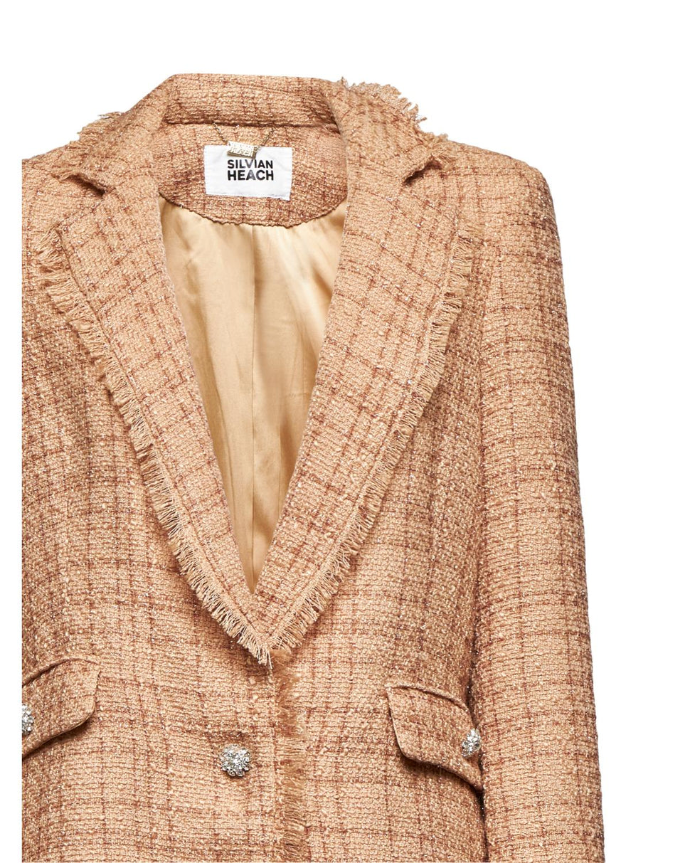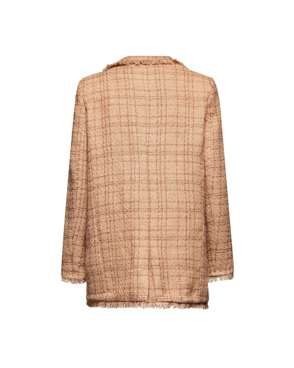 Giacca in tweed con frange leggere sui bordi. Un omaggio allo stile classico reinterpretato con dettagli materici e taglio rilassato.