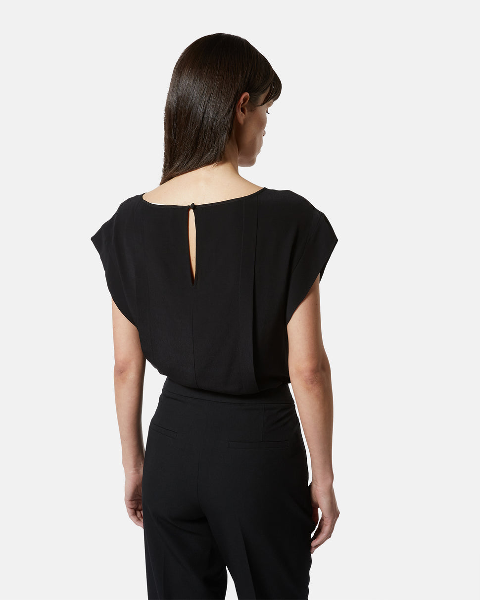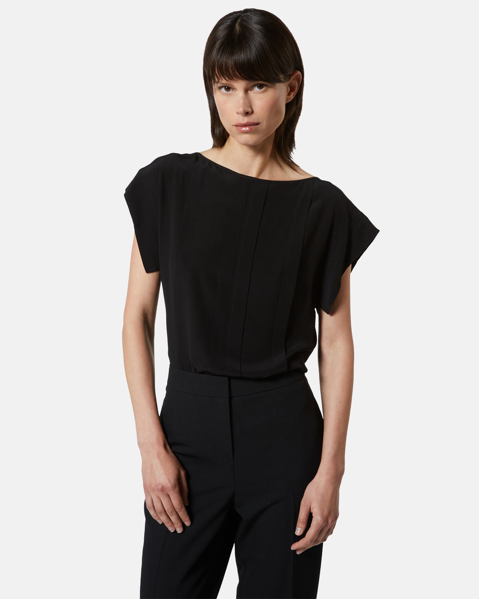 Un capo essenziale dal design minimal e sofisticato. La blusa con maniche a kimono si distingue per la sua linea fluida e versatile, perfetta per creare look eleganti e contemporanei. Indossala con pantaloni sartoriali per un outfit formale o con un denim per un tocco casual-chic.