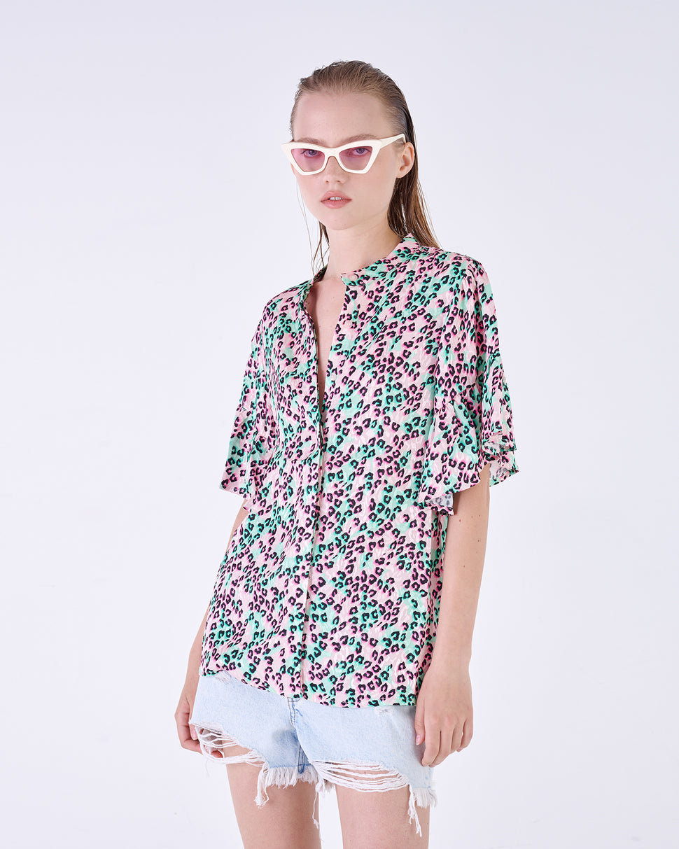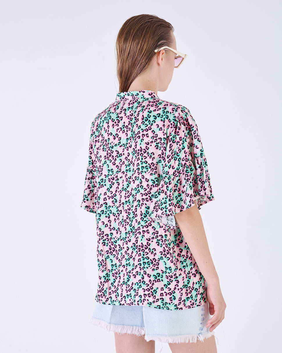Blusa a fantasia leopardata con maniche ad aletta. Collo alla coreana e chiusura sul davanti con bottoni.