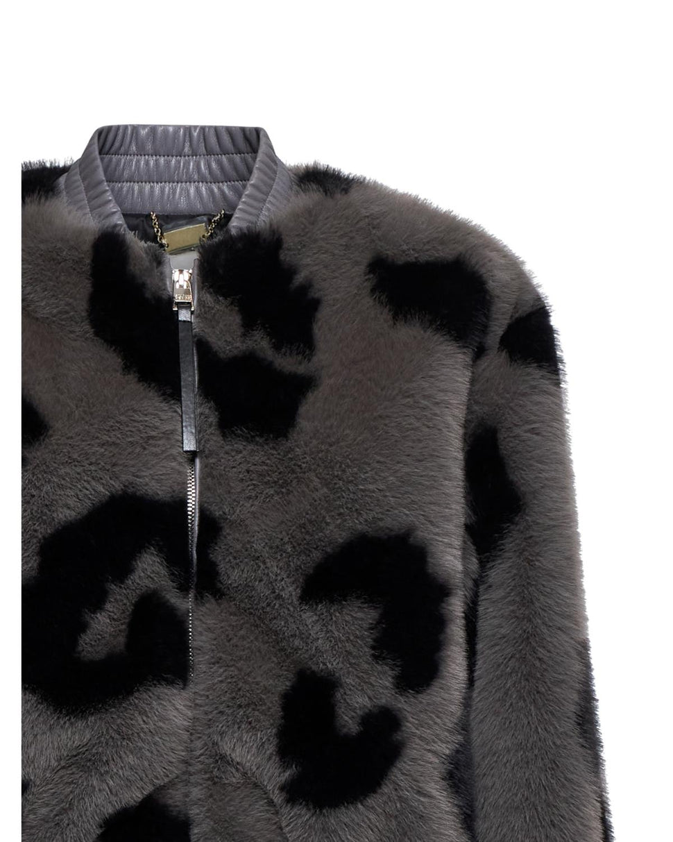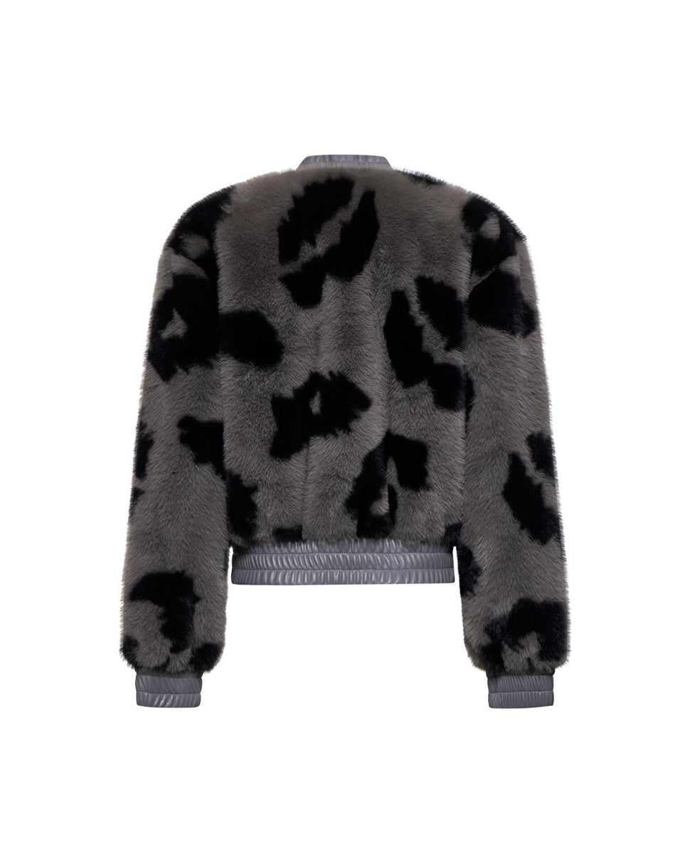 Bomber corto in pelliccia sintetica con stampa irregolare e zip frontale. Un capo di carattere dall’anima urbana.