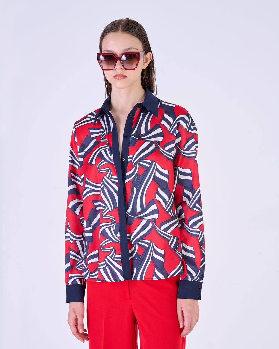 Camicia a fantasia, collo a camicia, chiusura sul davanti con bottoni, maniche lunghe.