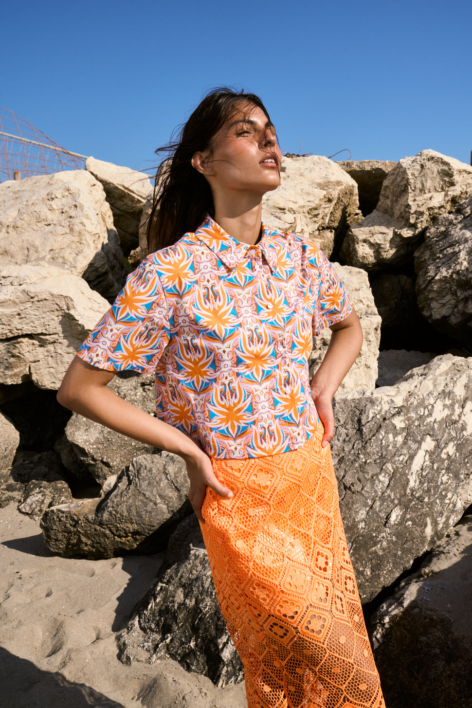 Una camicia vivace e colorata con stampa tropicale, perfetta per aggiungere un tocco di energia e freschezza al look estivo. Il design a maniche corte e il colletto classico la rendono versatile e ideale per ogni occasione casual.