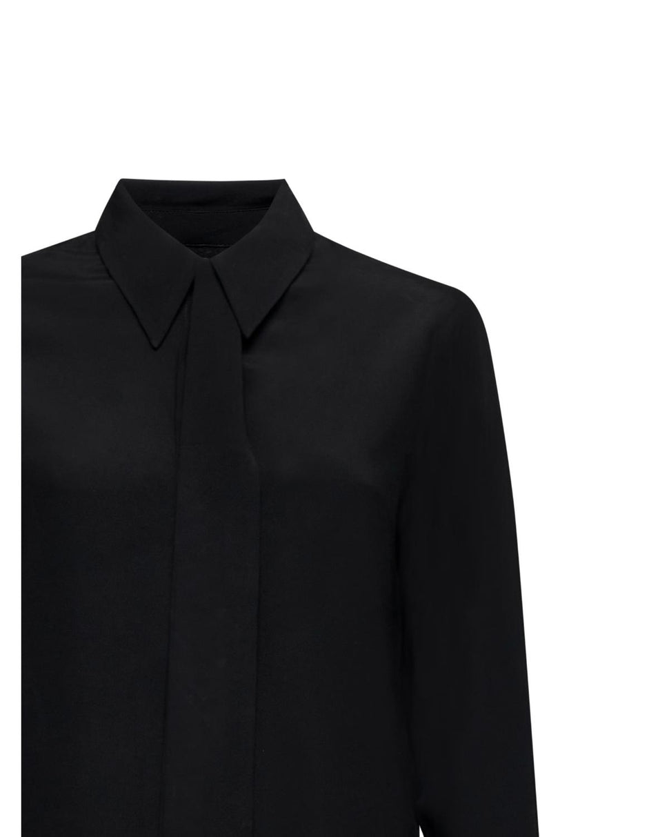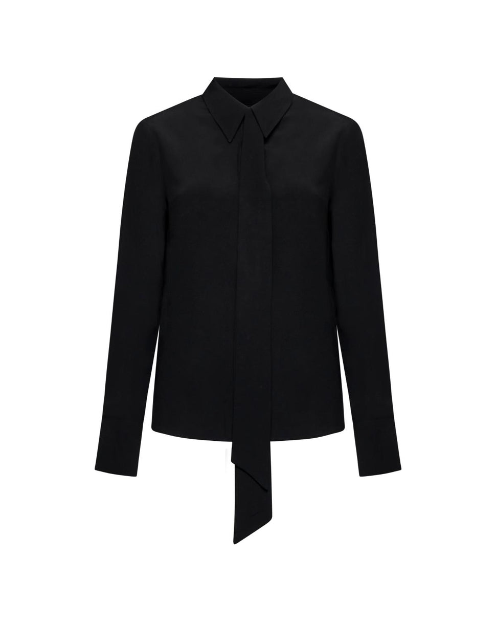 Una camicia nera dal taglio dritto con dettaglio cravatta applicato sul collo. Un capo versatile che aggiunge carattere senza rinunciare all’eleganza.