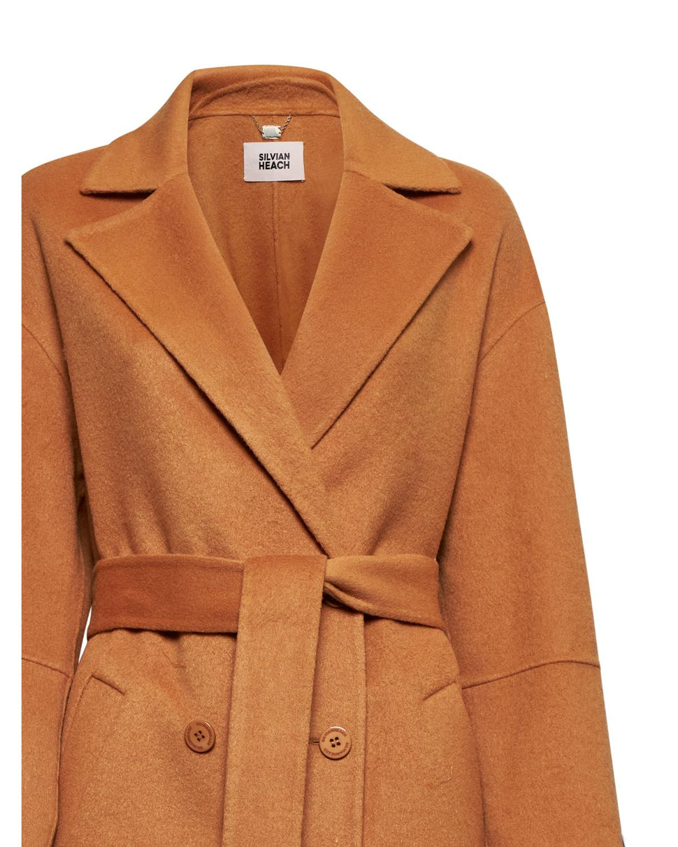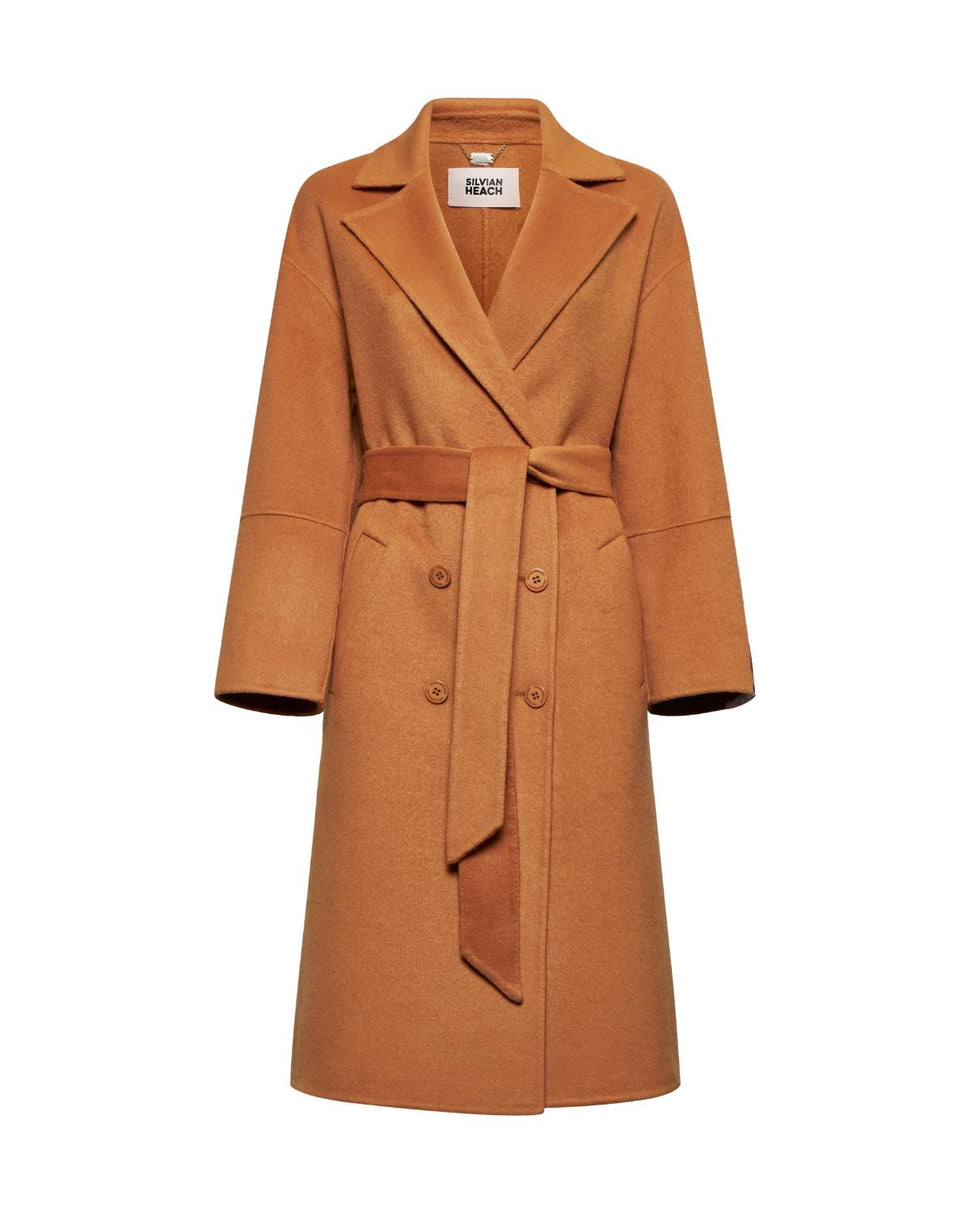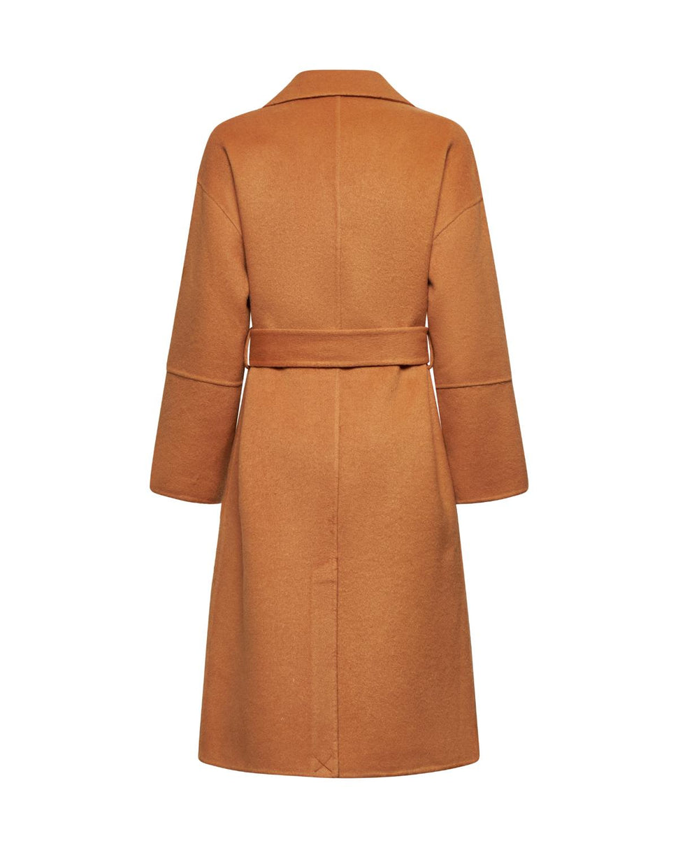 Cappotto con taglio fluido, chiusura doppiopetto e cintura abbinata. La costruzione ampia si stringe in vita.
