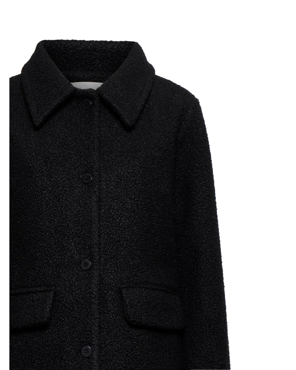 Cappotto monopetto con collo classico e tasche con pattina. La superficie testurizzata richiama la tradizione sartoriale.
