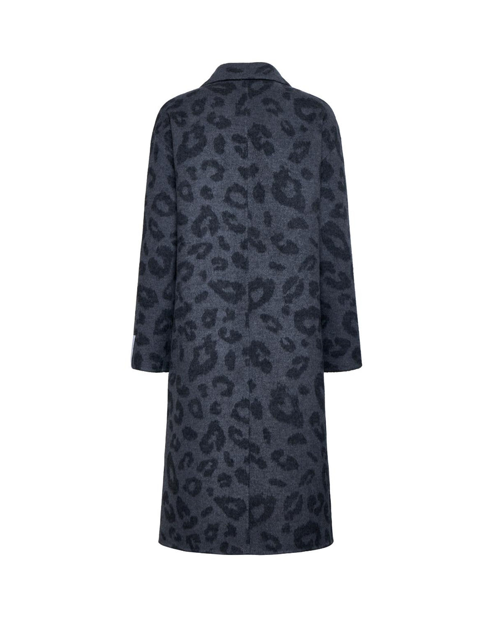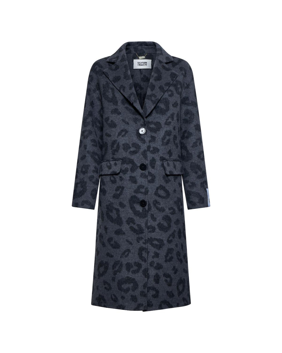 Cappotto dritto con stampa all-over e costruzione monopetto. L’effetto visivo è dinamico ma equilibrato.