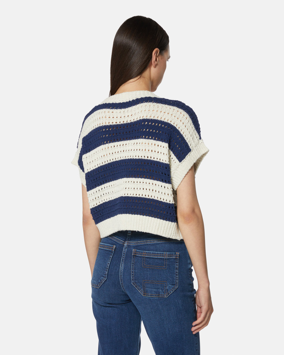 Un capo perfetto per un look casual ma ricercato. Questo cardigan corto in maglia traforata si distingue per il design a righe marinière e i bottoni dorati che aggiungono un tocco raffinato. Ideale per abbinamenti versatili, dalla gonna ai jeans.