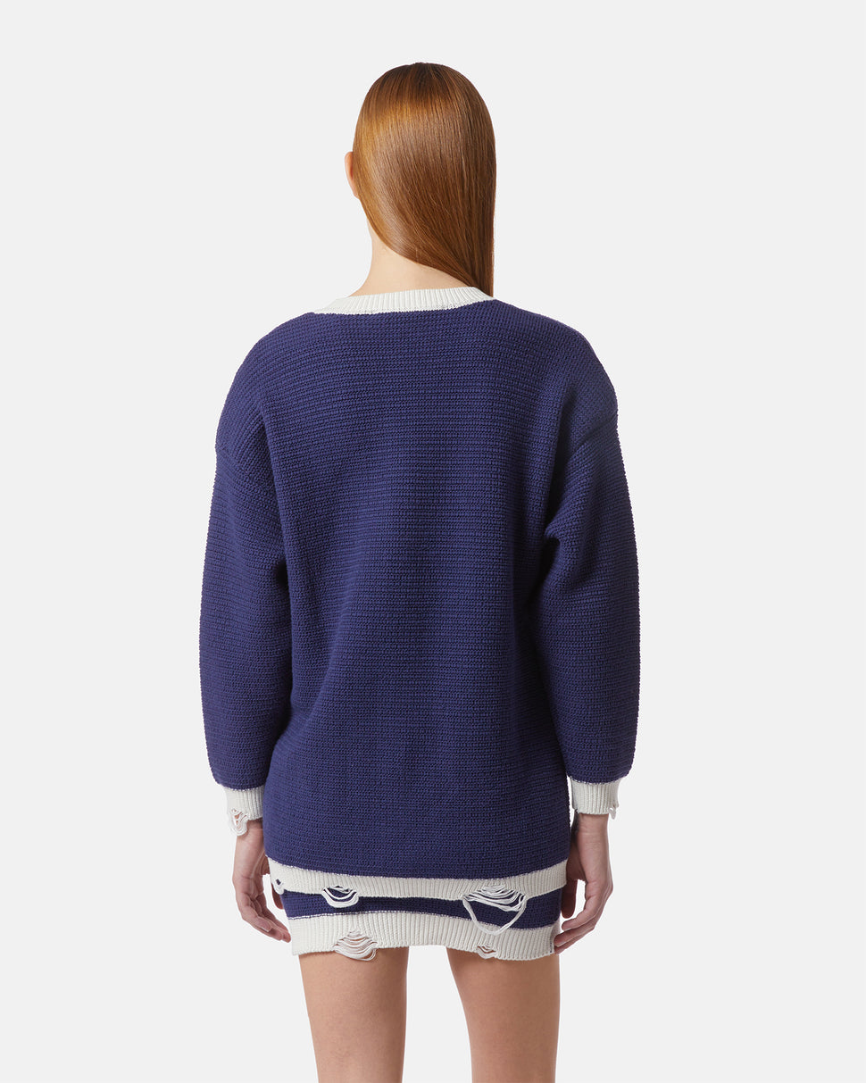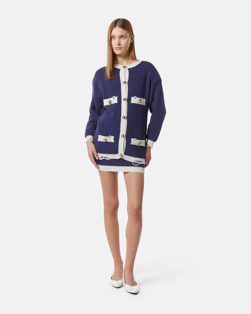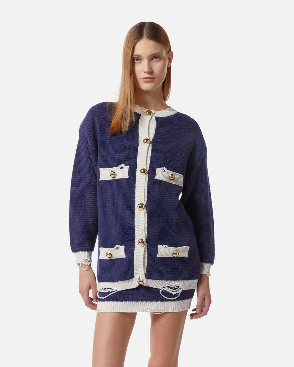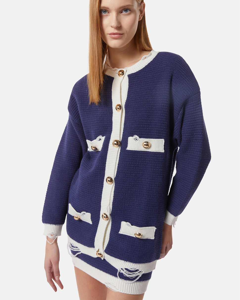 Un capo raffinato che unisce il fascino classico alla modernità dei dettagli distressed. La lavorazione a maglia morbida garantisce comfort e calore, mentre il design a contrasto con bottoni dorati aggiunge un tocco sofisticato. Perfetto per un look chic e senza tempo.
