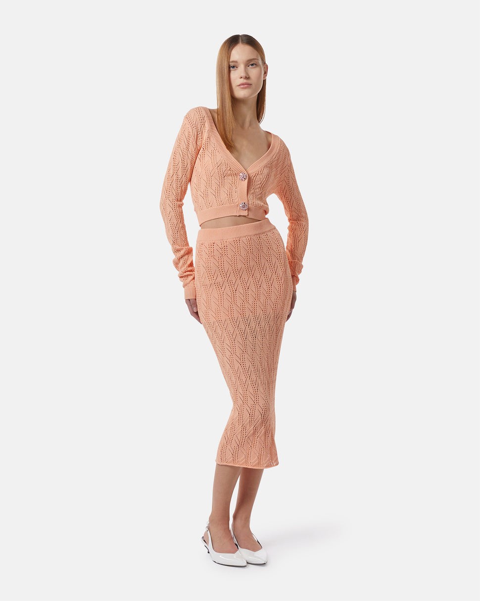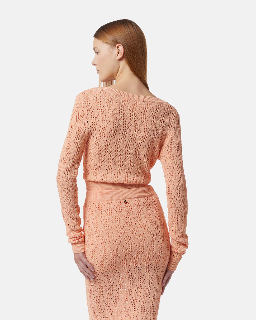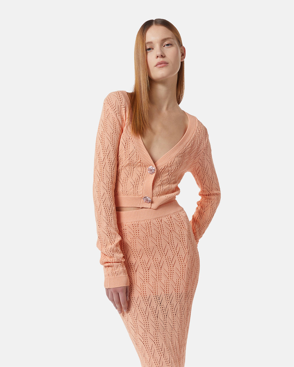 Un capo raffinato e femminile, perfetto per un look elegante ma disinvolto. Il design traforato conferisce leggerezza e un tocco romantico, mentre i bottoni gioiello aggiungono una nota di luminosità.