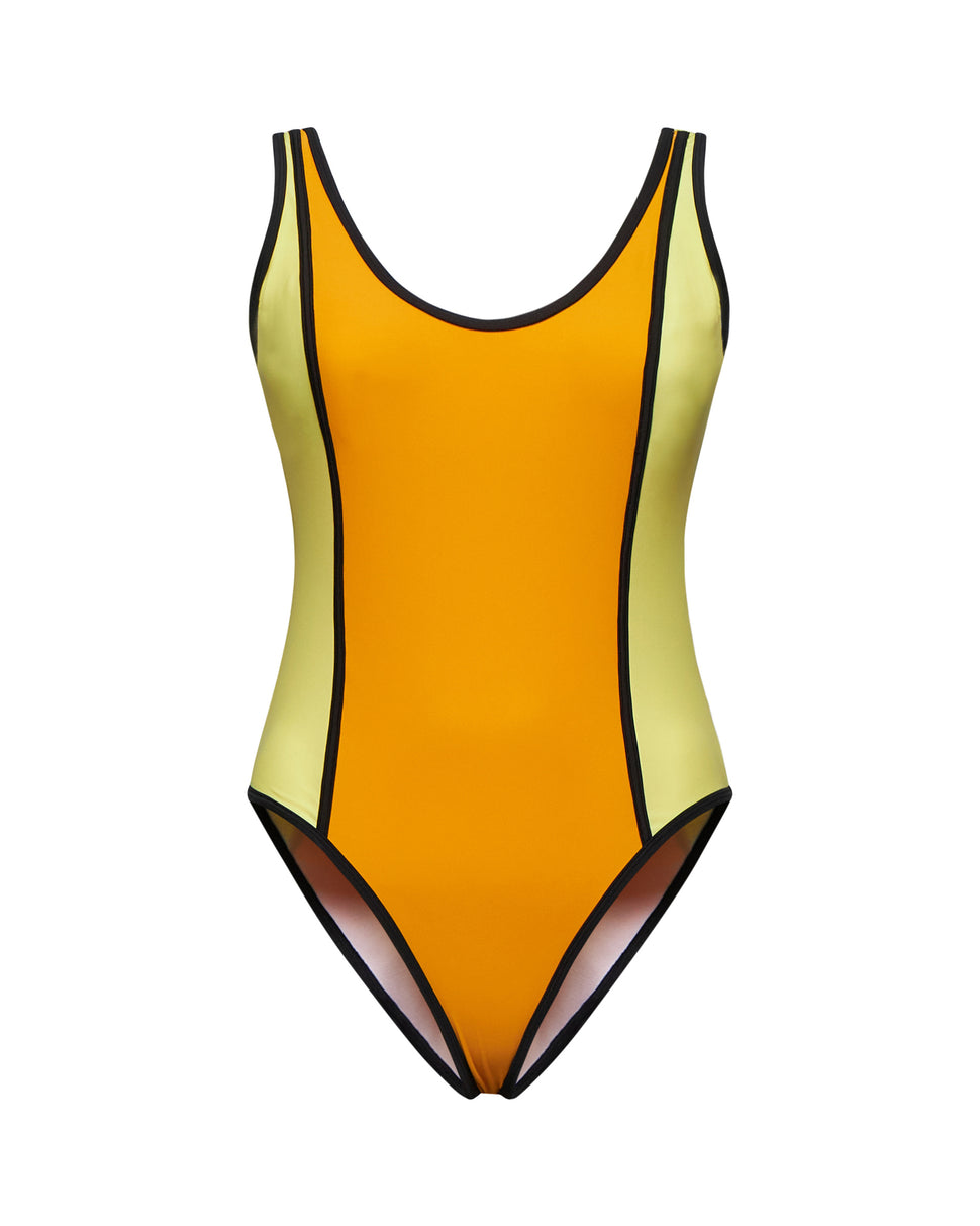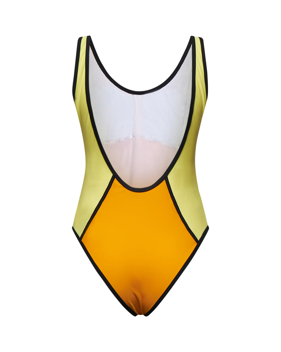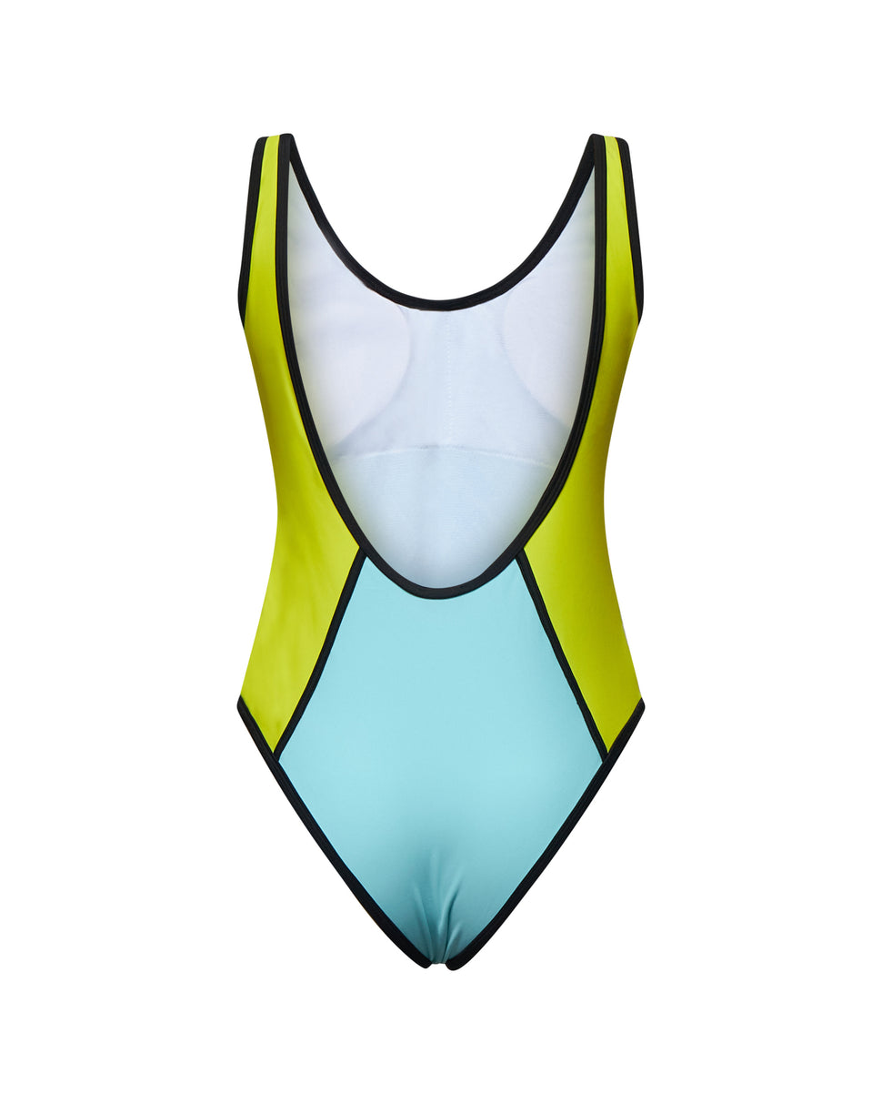 Un costume intero di tendenza che gioca con i contrasti cromatici per esaltare le forme. Il design elegante in sfumature vibranti, definito da profili neri, dona un effetto snellente e sofisticato, perfetto per chi cerca stile e originalità in spiaggia o a bordo piscina.
