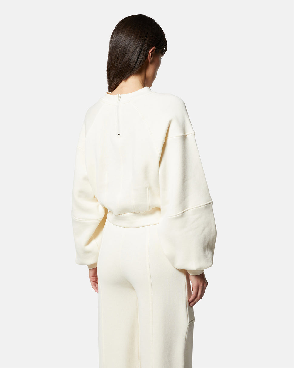 - Maniche ampie con cuciture raglan: aggiungono volume e un tocco sportivo.
