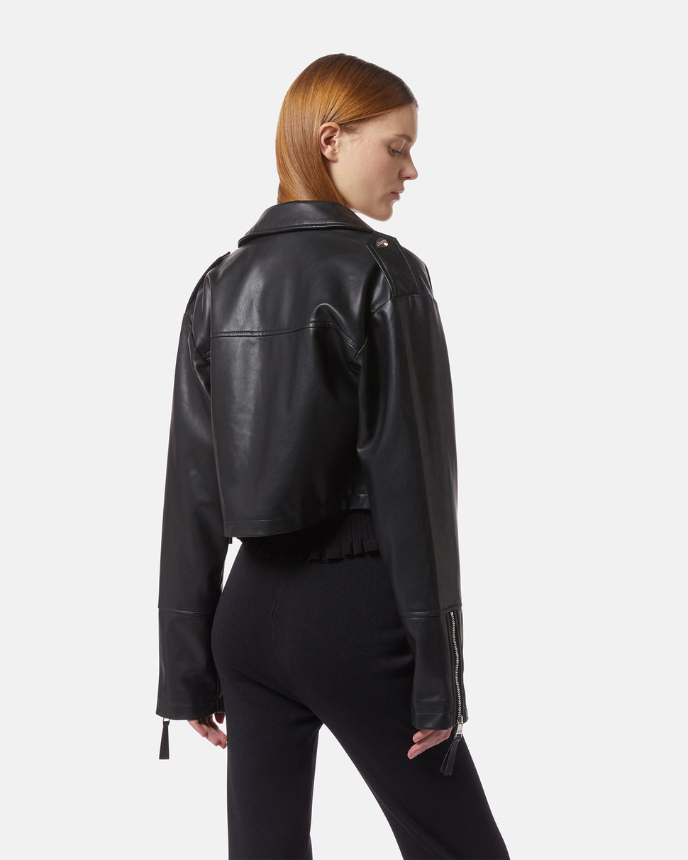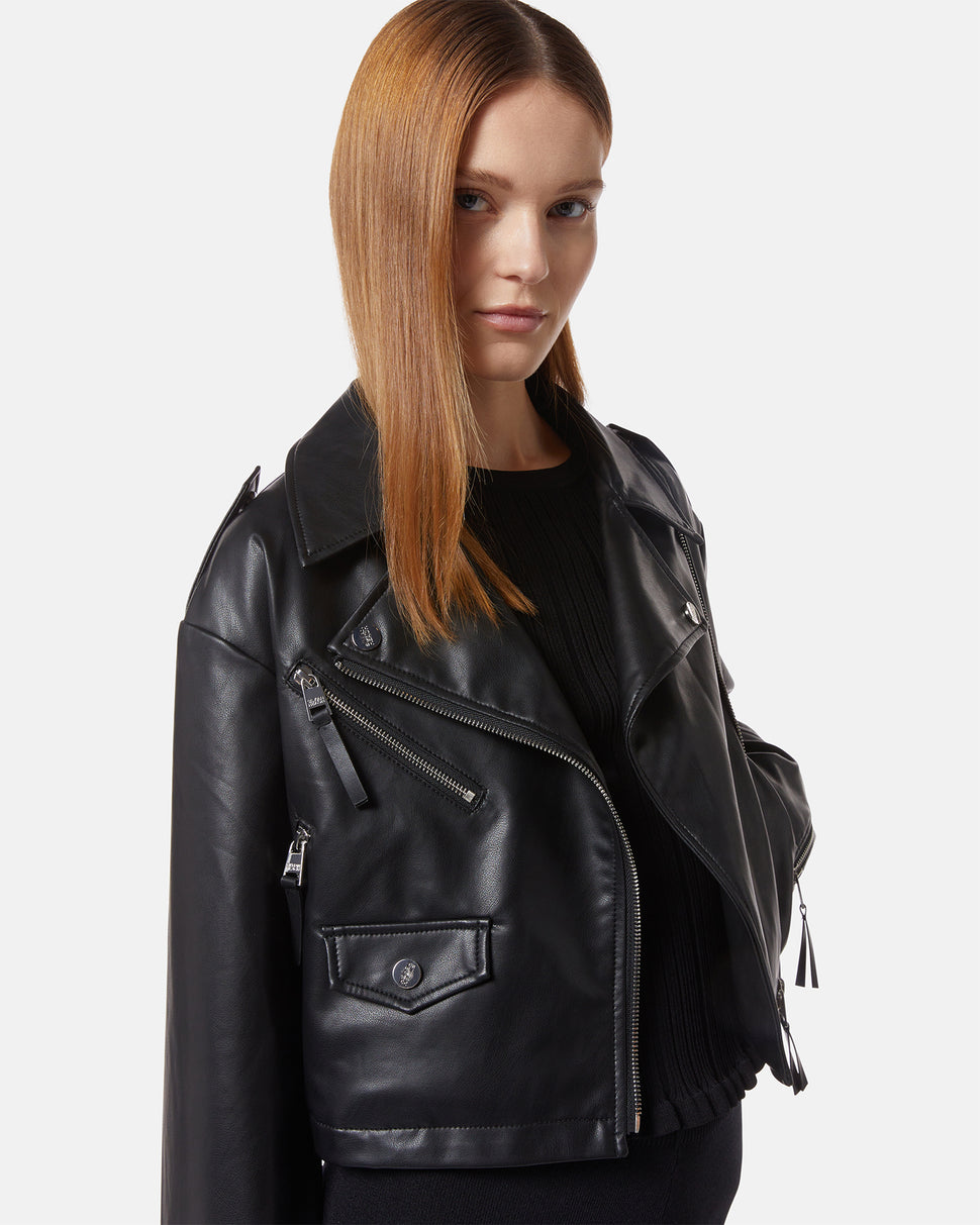 Giacca biker in ecopelle dal carattere grintoso e contemporaneo, perfetta per aggiungere un tocco di stile rock-chic a qualsiasi look. Il design cropped valorizza la silhouette, mentre i revers ampi con dettagli metallici conferiscono un aspetto deciso e sofisticato. La chiusura frontale con zip asimmetrica enfatizza il design iconico del modello, rendendolo versatile e adatto a diverse occasioni. Le tasche con cerniera offrono funzionalità senza rinunciare all'estetica, mentre i dettagli con bottoni a pressione su colletto e tasche aggiungono un ulteriore tocco di carattere.