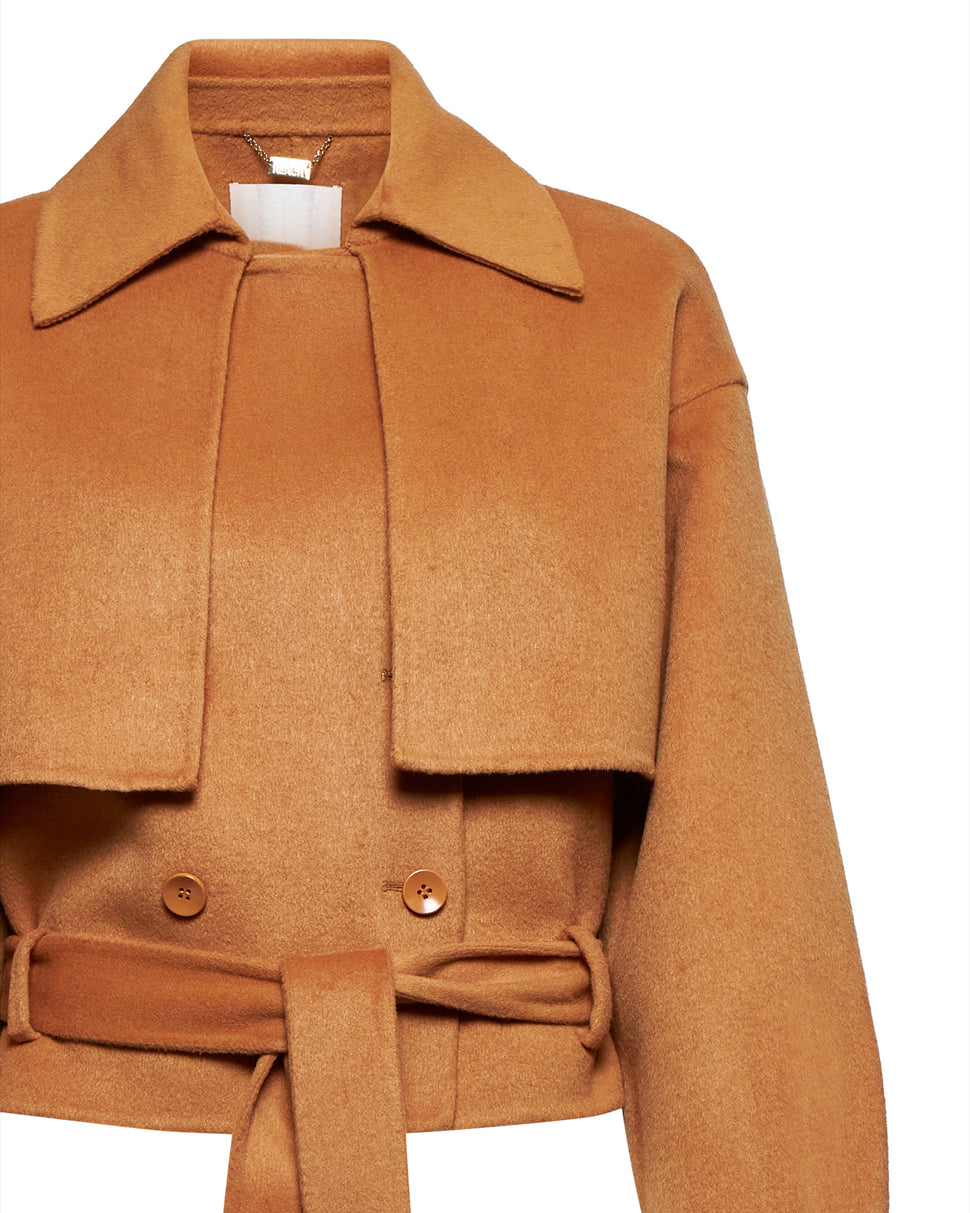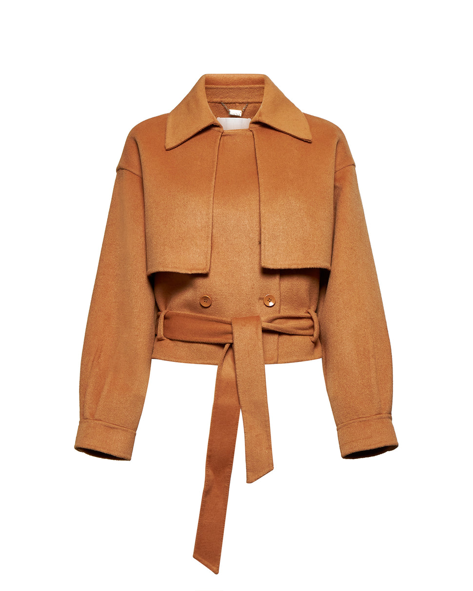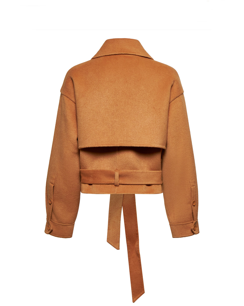Giacca cropped con colletto classico, chiusura doppiopetto e cintura abbinata. Linee nette e struttura compatta.