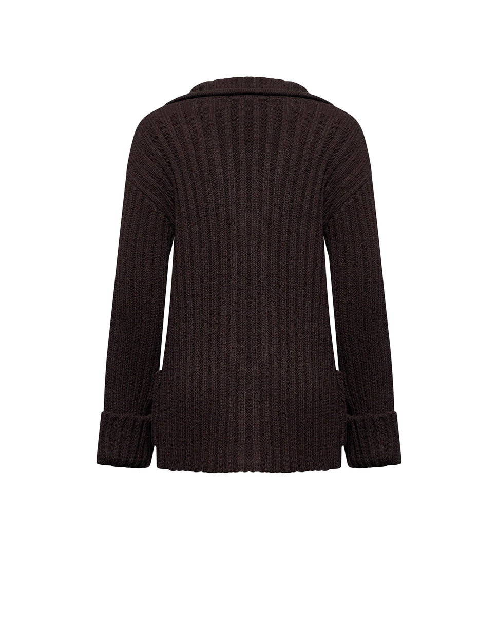 Giacca in maglia lavorata a coste larghe con chiusura doppiopetto e cintura rimovibile. Il volume morbido e il collo drappeggiato la rendono avvolgente.