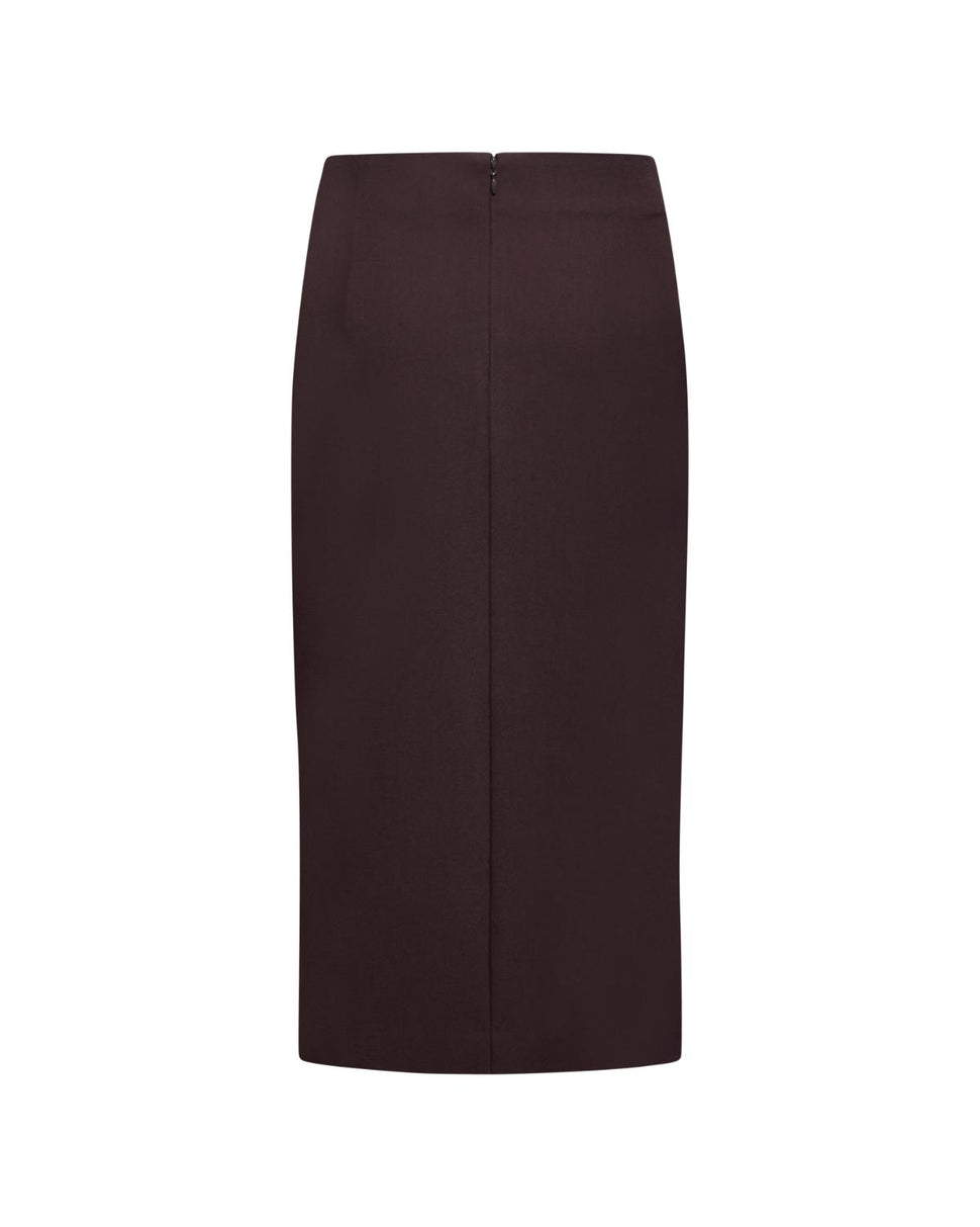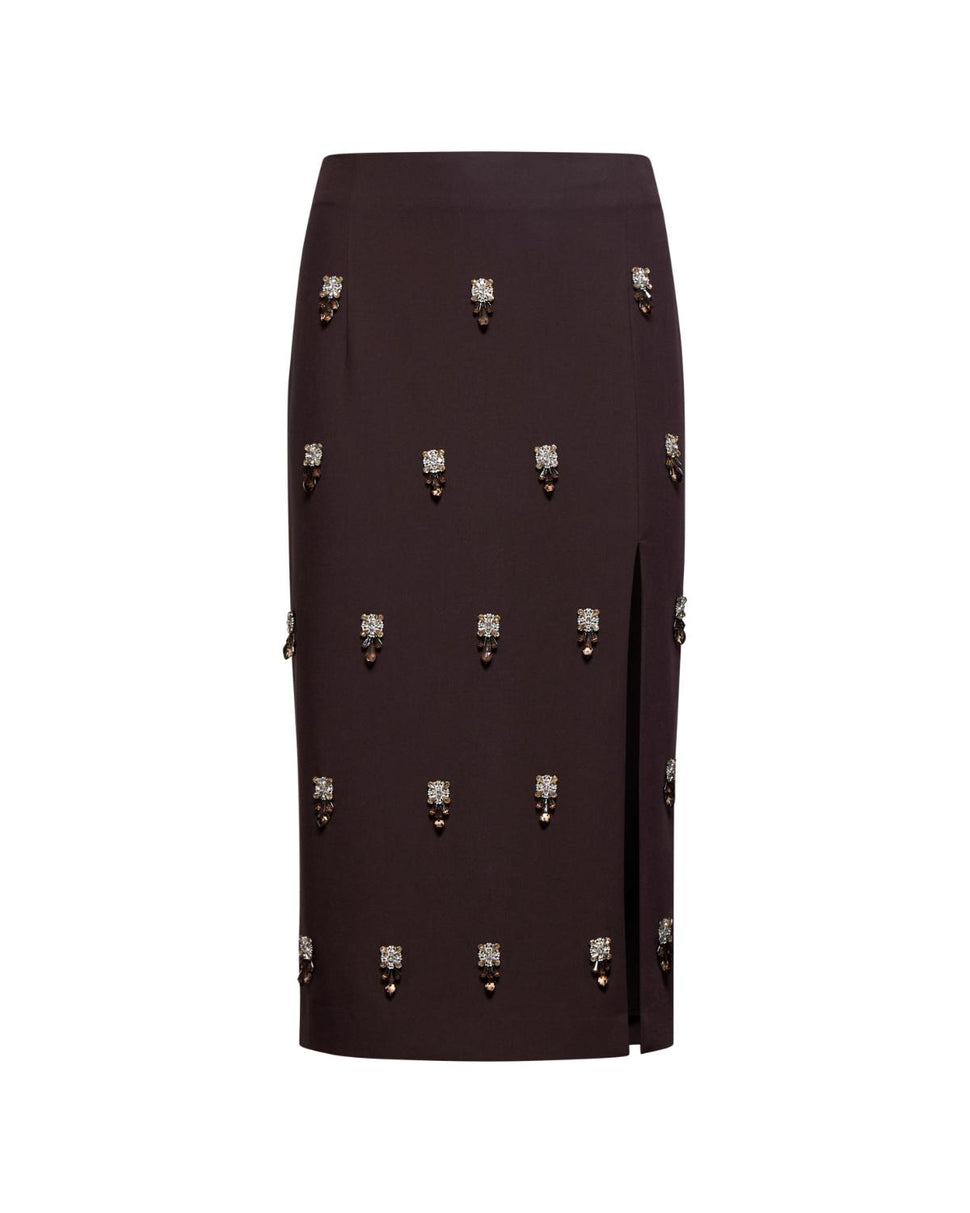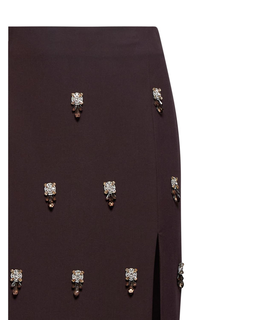 Gonna midi dal taglio pulito arricchita da piccoli elementi gioiello applicati a distanza regolare. Essenziale con un tocco luminoso inatteso.