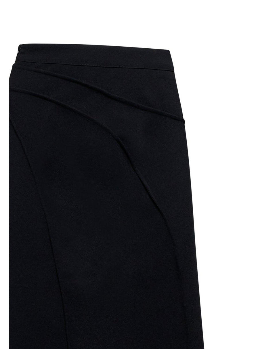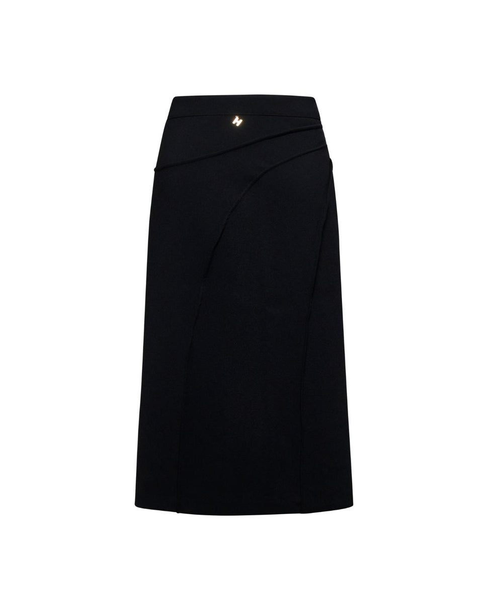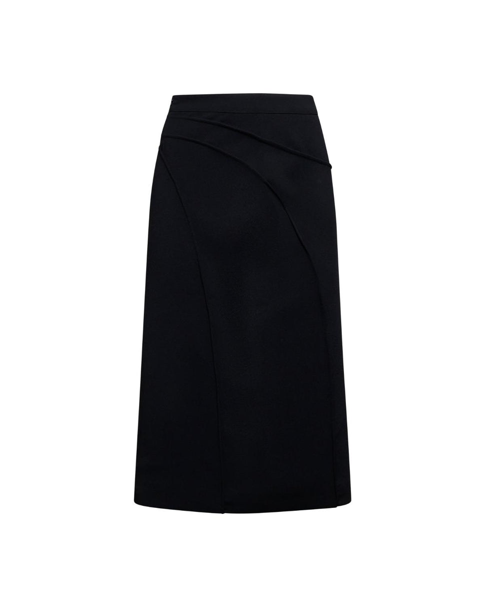 Gonna dritta con costruzione asimmetrica sul davanti. Un dettaglio sobrio che rinnova l’essenzialità del capo.
