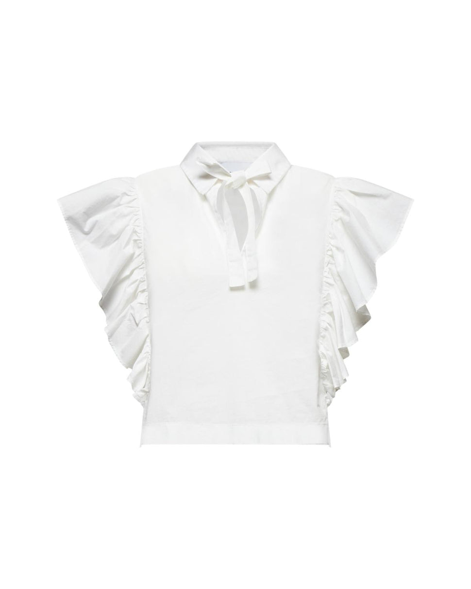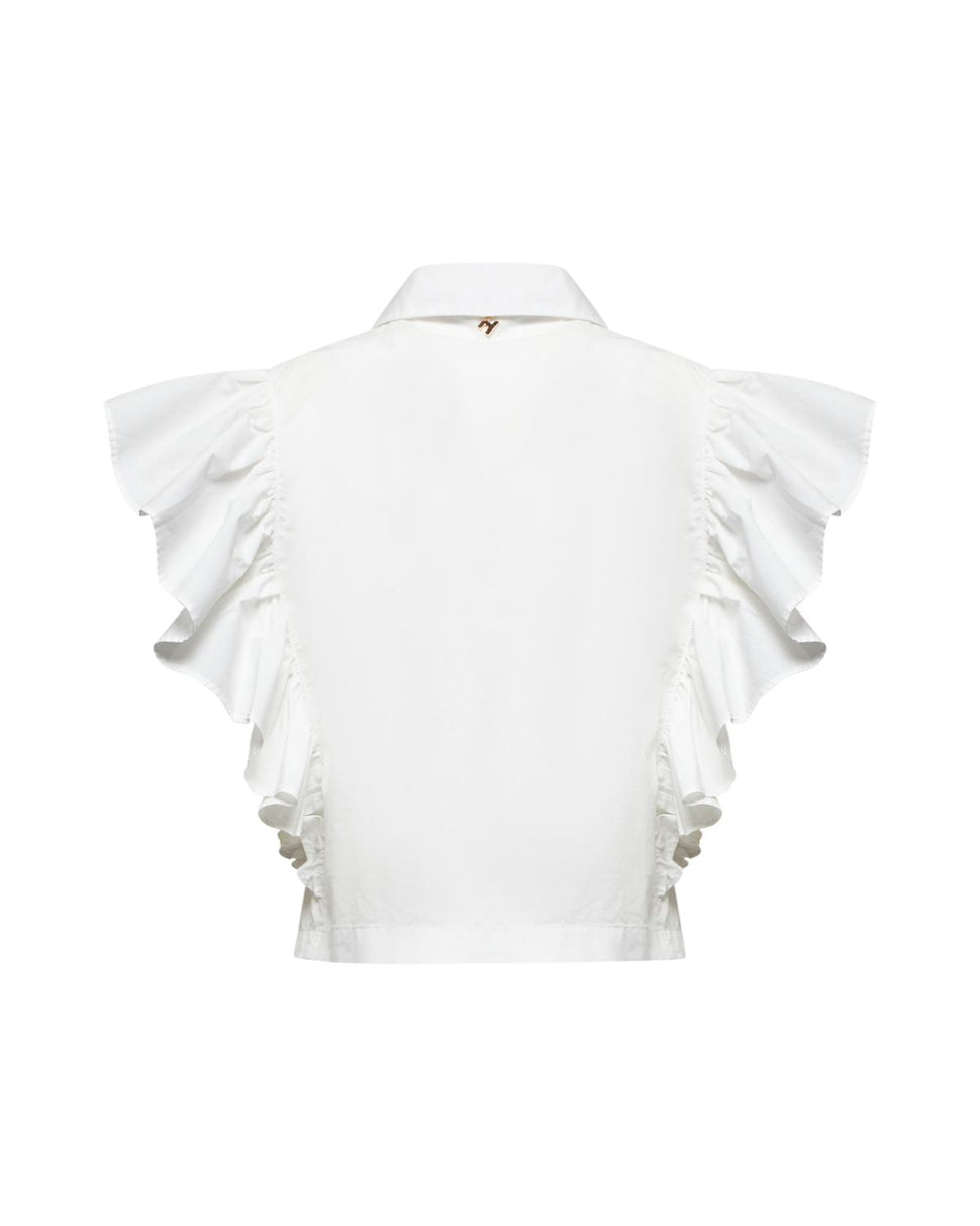 Una blusa sofisticata e fresca, impreziosita da eleganti ruches lungo le maniche e un fiocco centrale che esalta il design. Perfetta per un look casual ma chic, ideale per eventi estivi o serate informali.