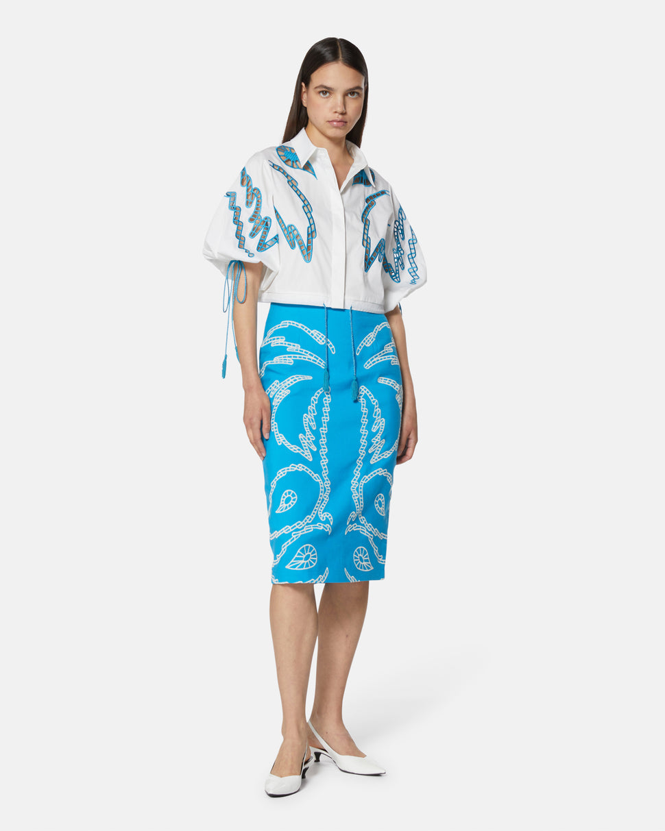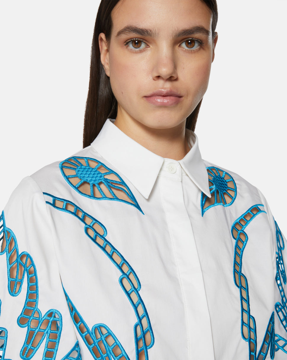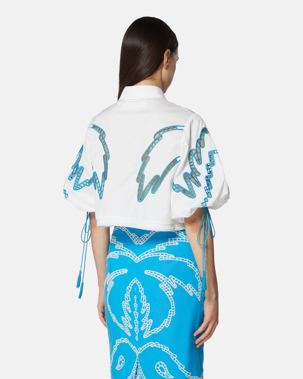 Un capo sofisticato e di tendenza, perfetto per aggiungere un tocco di freschezza al guardaroba estivo. Questa camicia cropped in cotone leggero presenta dettagli ricamati traforati sulle maniche e sul davanti, creando un effetto raffinato e femminile. Le maniche ampie con laccetti regolabili donano volume e carattere, mentre il taglio corto la rende ideale da abbinare a gonne a vita alta o pantaloni palazzo per un look chic e moderno.