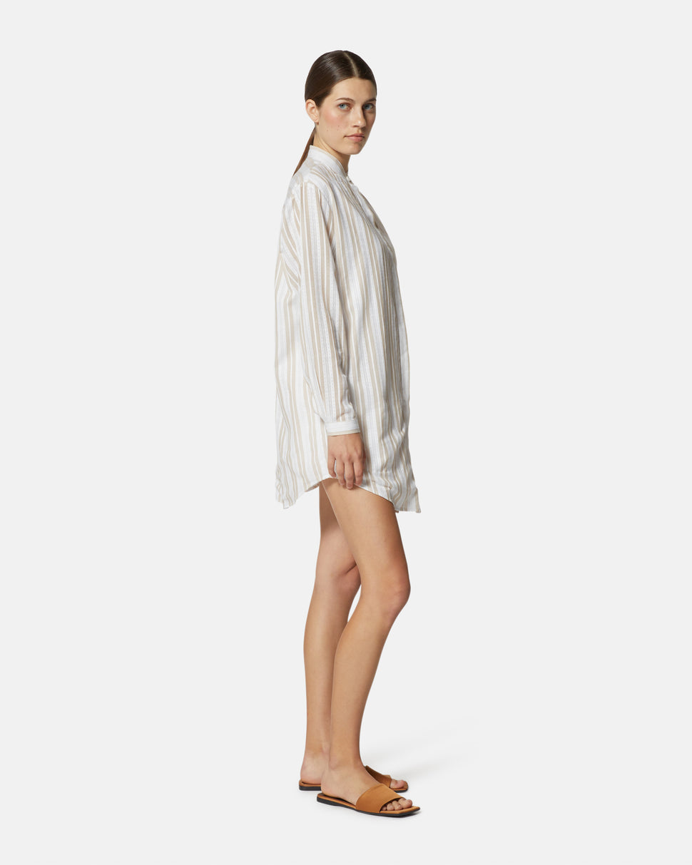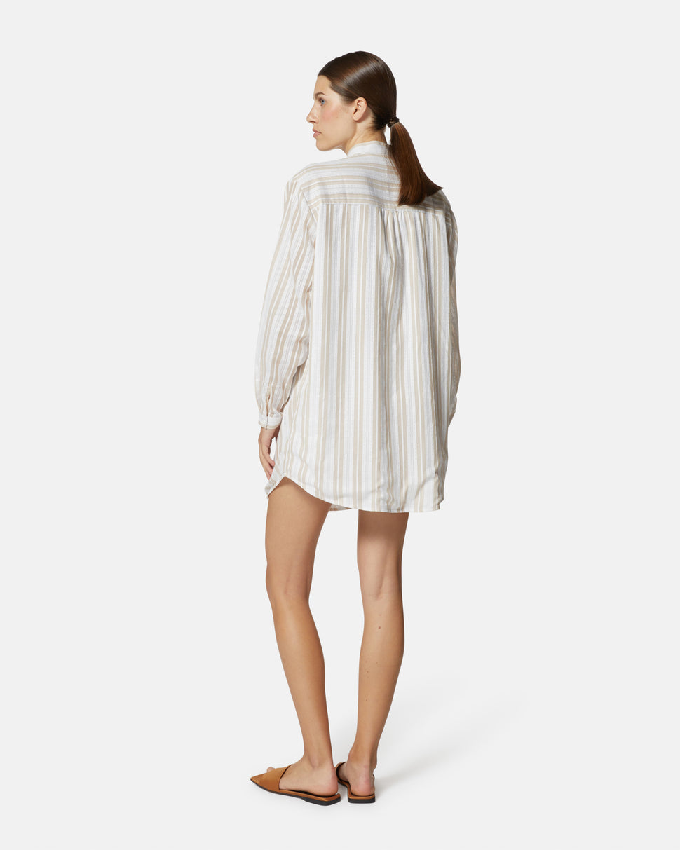 Un capo versatile e di tendenza, perfetto per look casual e raffinati. Questa camicia oversize in cotone leggero presenta un elegante motivo a righe verticali e un moderno collo alla coreana, che dona un tocco minimal e sofisticato. Il design lungo e morbido permette di indossarla sia come camicia classica che come mini-abito, ideale per outfit rilassati ma eleganti.