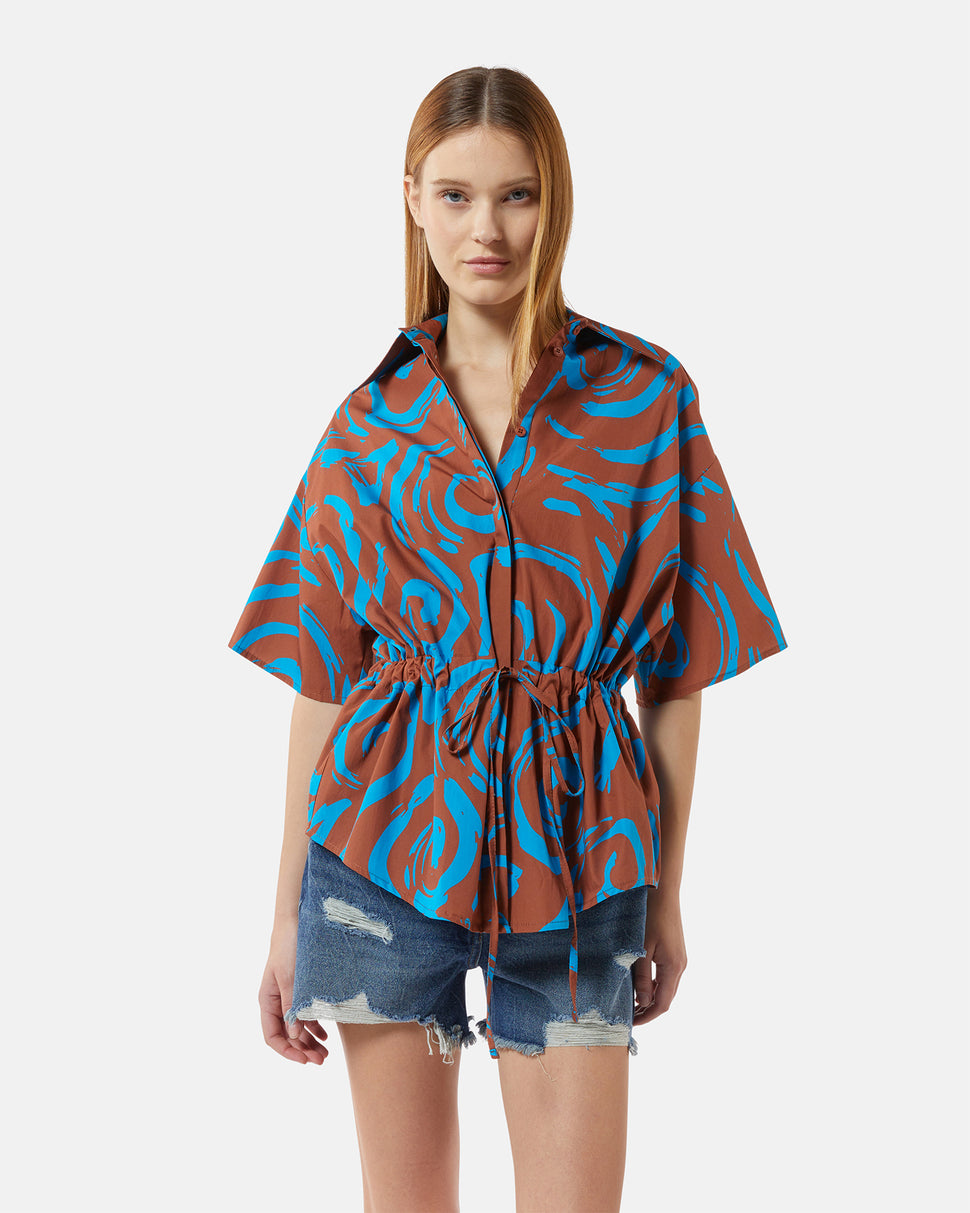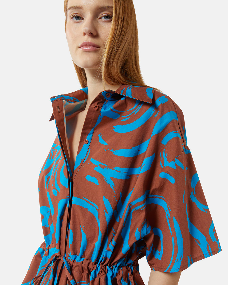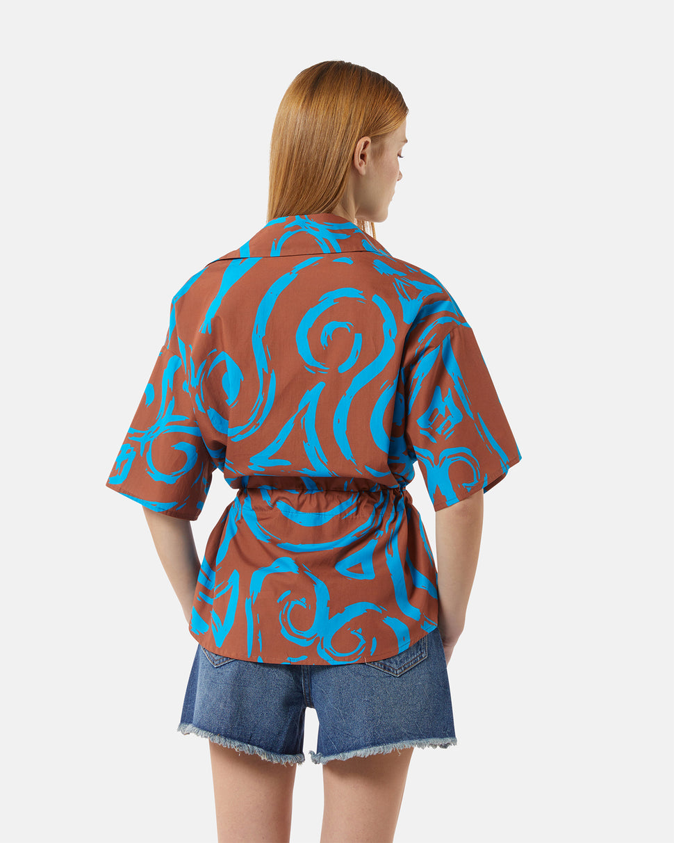 Un capo di tendenza che unisce comfort e stile. Questa camicia oversize è caratterizzata da una stampa grafica audace che dona un look moderno e distintivo. Il taglio ampio con maniche corte garantisce una vestibilità rilassata, mentre la cintura regolabile in vita permette di personalizzare la silhouette. Perfetta per essere indossata sia come camicia che come giacca leggera, ideale per outfit casual dal tocco sofisticato.