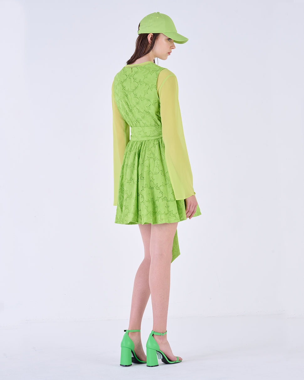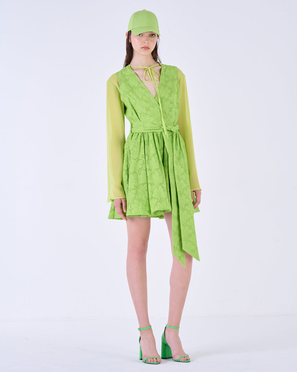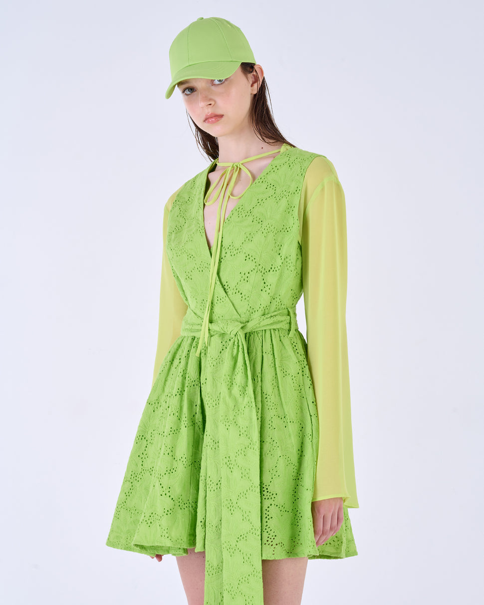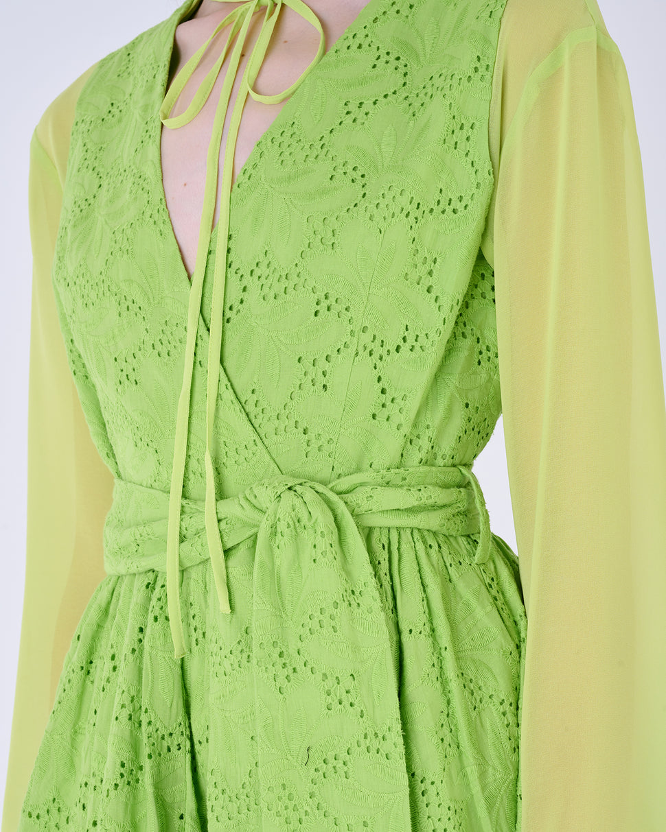 Abito ad incrocio con dettagli ricamati. Passanti in vita con cintura annodabile. Dettaglio laccetto al collo.