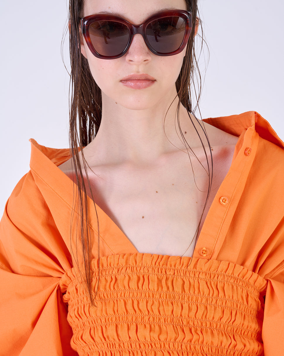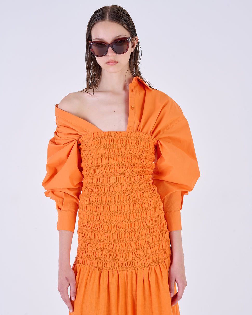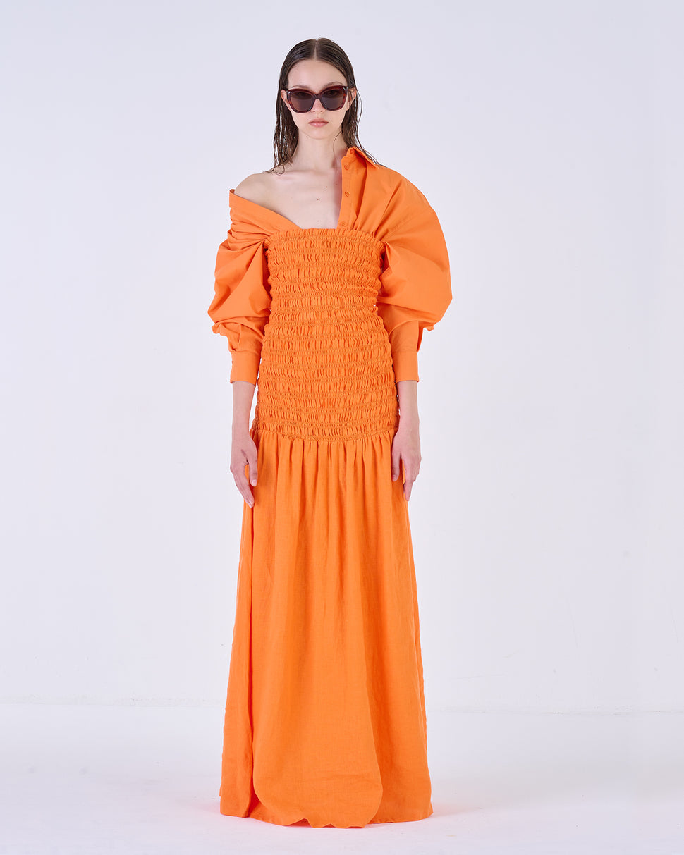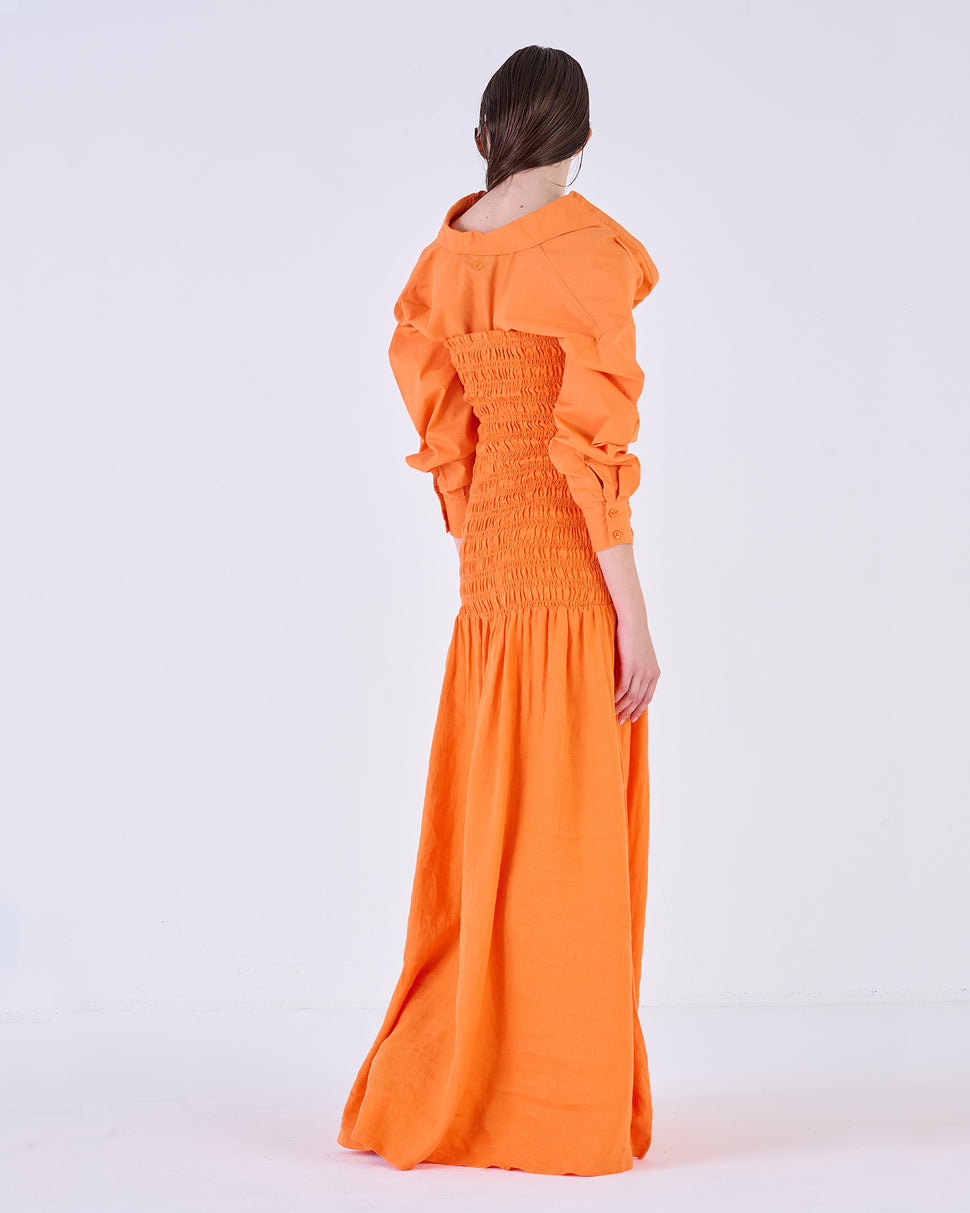 Abito lungo arricciato. Gonna ampia e schiena nuda. Linea aderente.