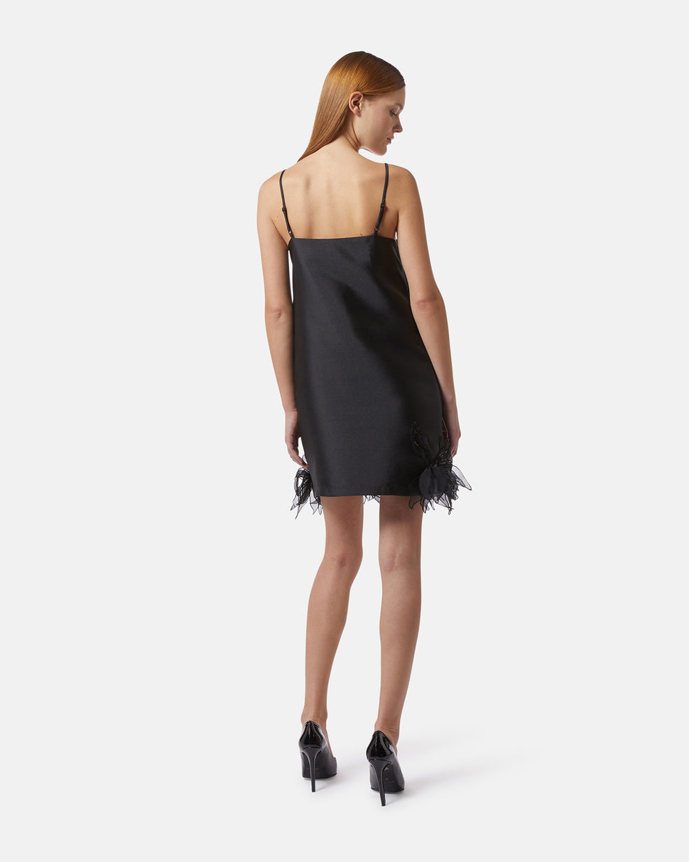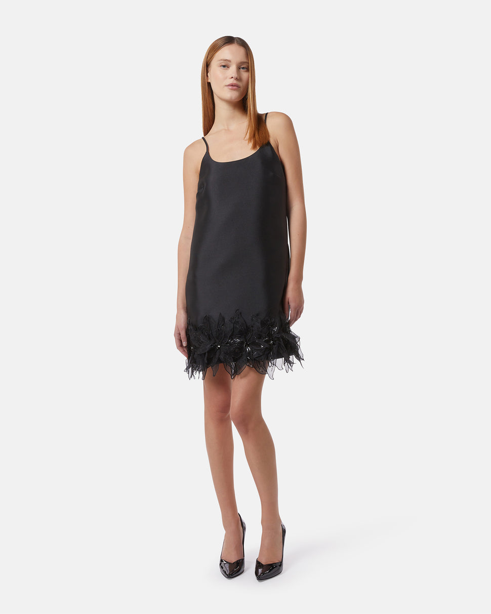 Un modello elegante e luminoso, perfetto per un look raffinato e femminile. La lunghezza sopra il ginocchio e le spalline sottili lo rendono ideale per occasioni speciali, mentre le decorazioni floreali e le paillettes aggiungono un tocco glamour.
