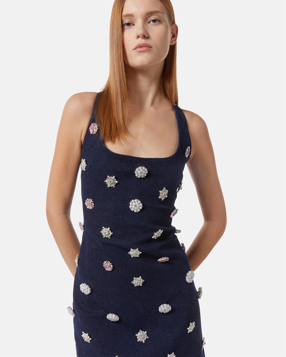 Un capo glam e sofisticato che unisce la versatilità del denim a dettagli preziosi. Realizzato in denim elasticizzato, offre una vestibilità aderente che valorizza la silhouette, con applicazioni gioiello che aggiungono un tocco di eleganza.
