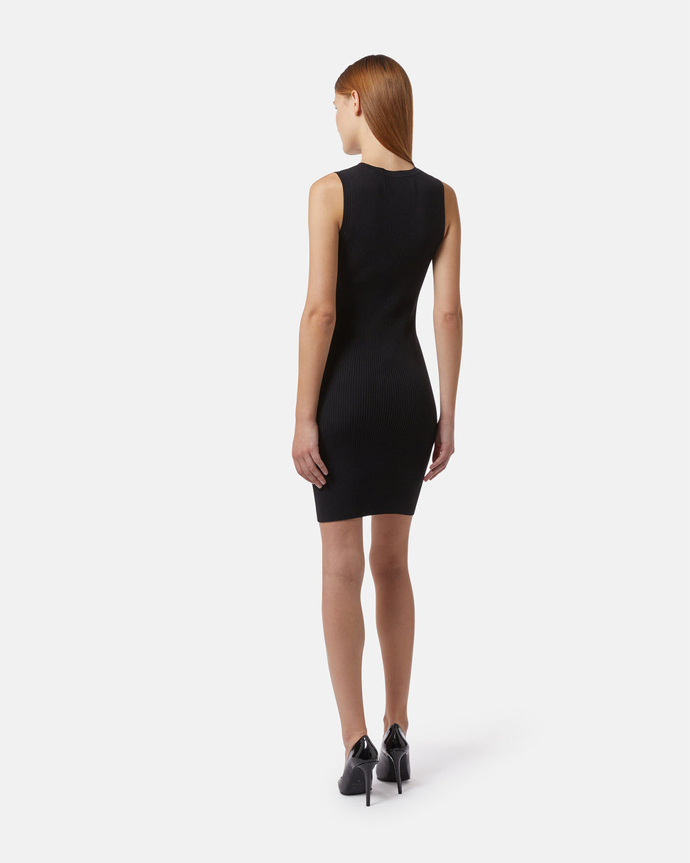 Abito corto in maglia a costine che combina comfort e stile in un design essenziale e moderno. Maglia a costine elasticizzata che avvolge la silhouette con una vestibilità aderente, esaltando le forme con naturalezza. Scollo tondo che dona equilibrio e versatilità, perfetto per diverse occasioni. Modello smanicato che garantisce libertà di movimento e freschezza, ideale per le stagioni più calde. Lunghezza sopra il ginocchio per un look femminile e dinamico, perfetto sia per il giorno che per la sera.