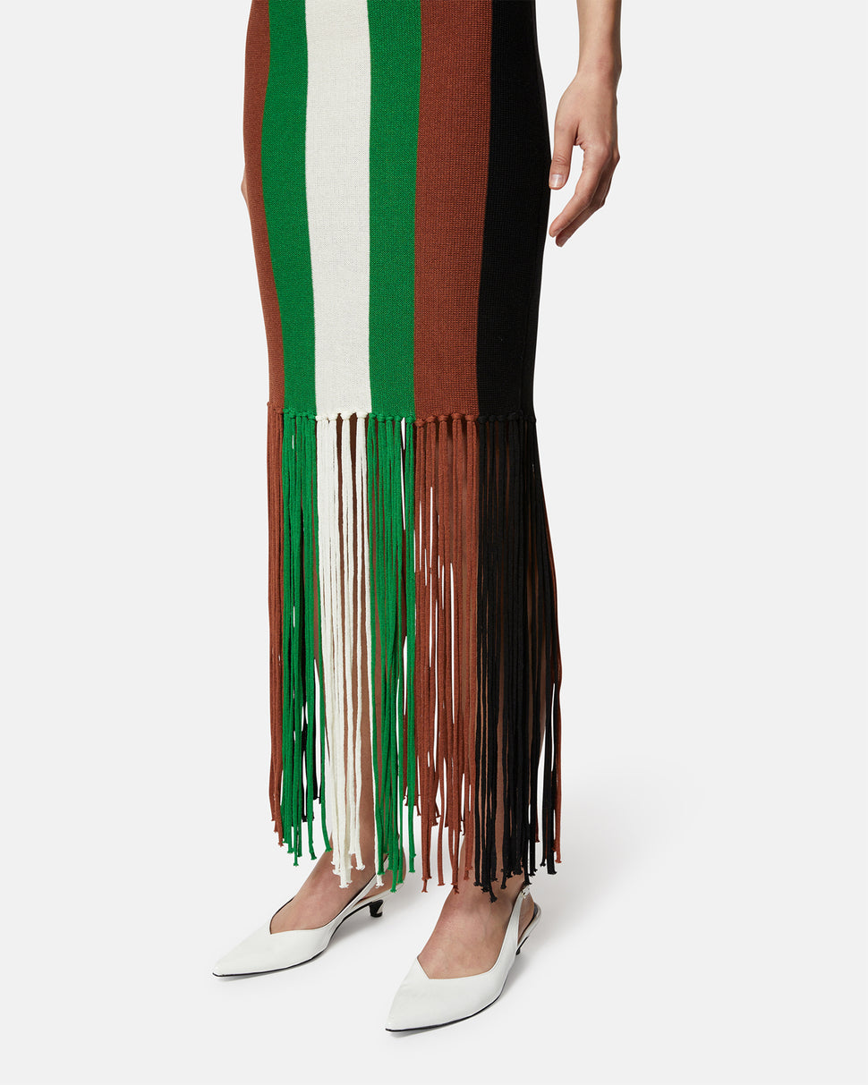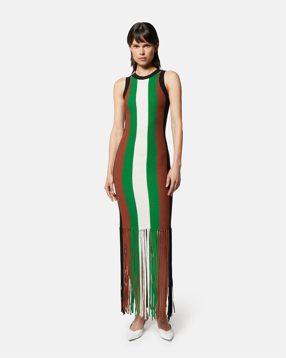 Abito lungo a righe multicolor che combina dinamismo e stile in un design audace e moderno. Maglia con righe verticali a contrasto che slanciano la figura, creando un effetto visivo accattivante. Scollo tondo e spalline larghe per un fit comodo e bilanciato. Frange lunghe applicate sull'orlo inferiore che aggiungono movimento e un tocco originale. Vestibilità aderente lungo tutta la silhouette per esaltare le forme con eleganza.