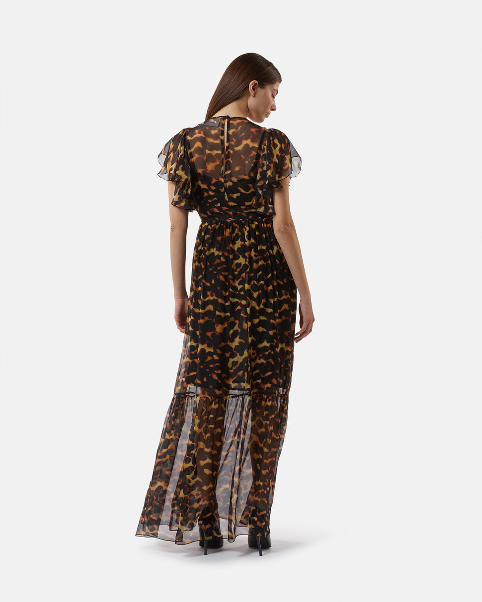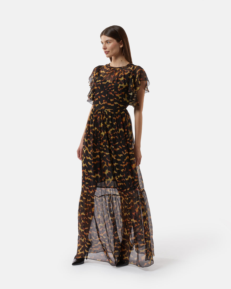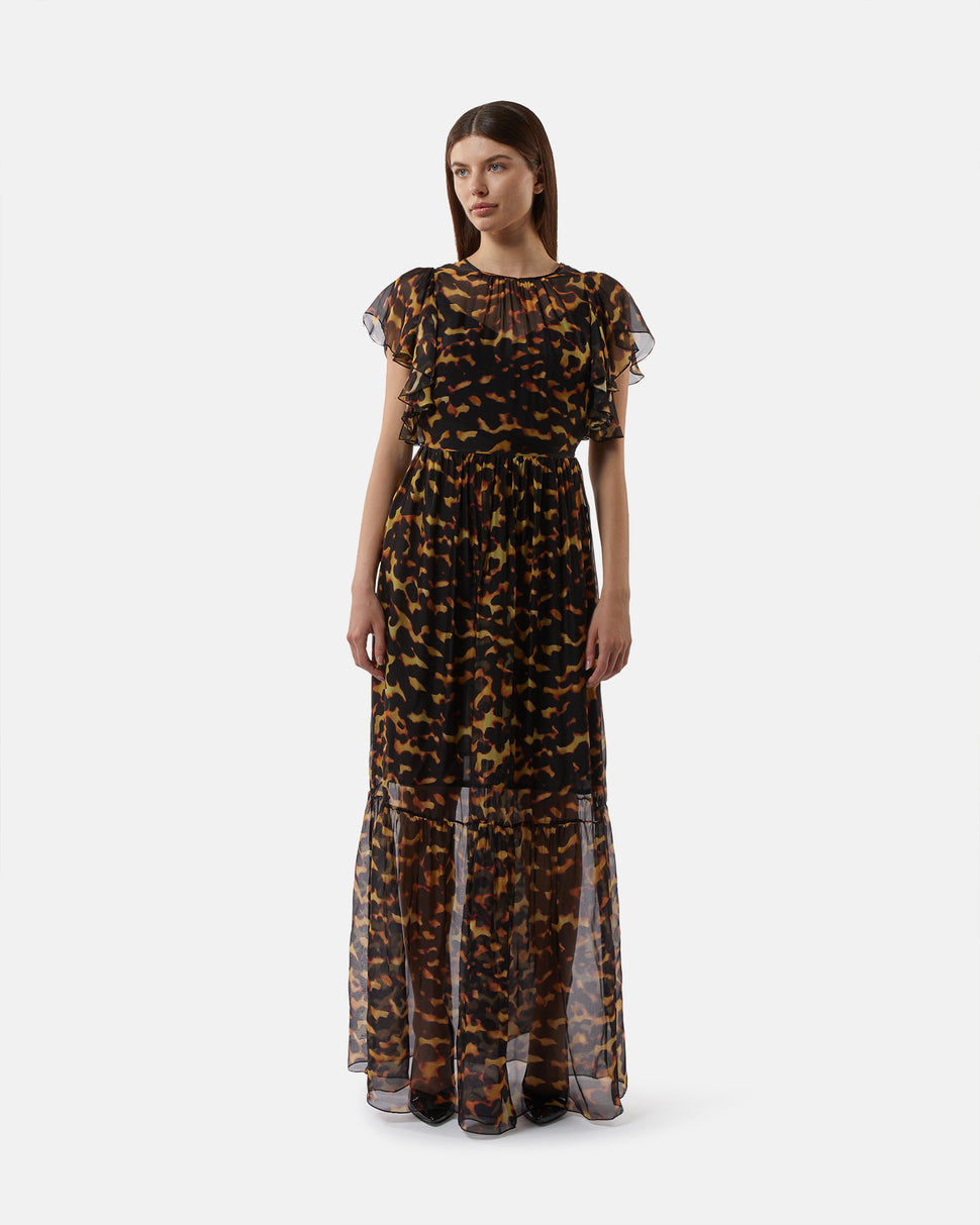 Un capo romantico e sofisticato, perfetto per occasioni speciali. Questo abito lungo in tulle leggero presenta una stampa floreale delicata che dona femminilità e charme. Le maniche ad aletta e il design semi-trasparente sul fondo creano un gioco di leggerezza e movimento, mentre la silhouette fluida assicura eleganza e comfort.