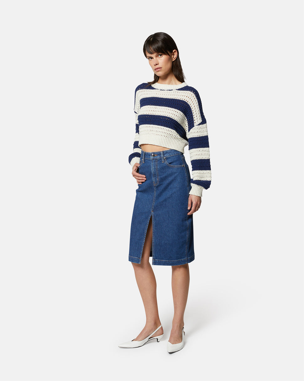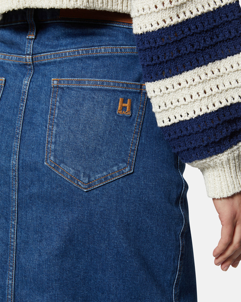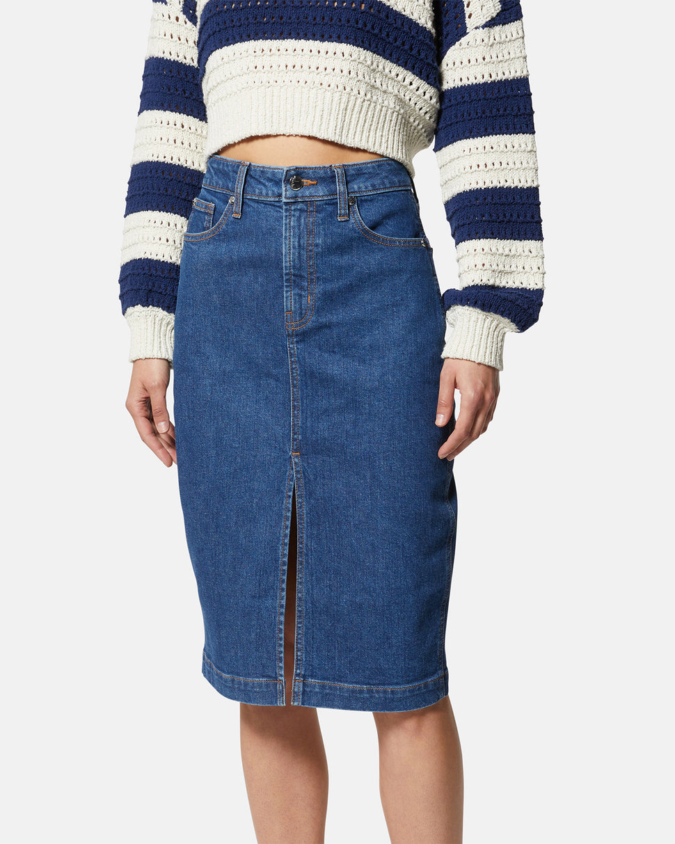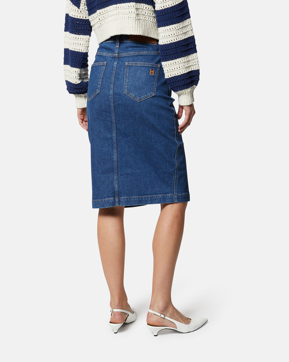Una gonna dal taglio classico in denim, con un elegante spacco frontale che aggiunge un tocco di femminilità al look. Perfetta per chi cerca un equilibrio tra comfort e stile, ideale per essere indossata sia con scarpe casual che con tacchi.