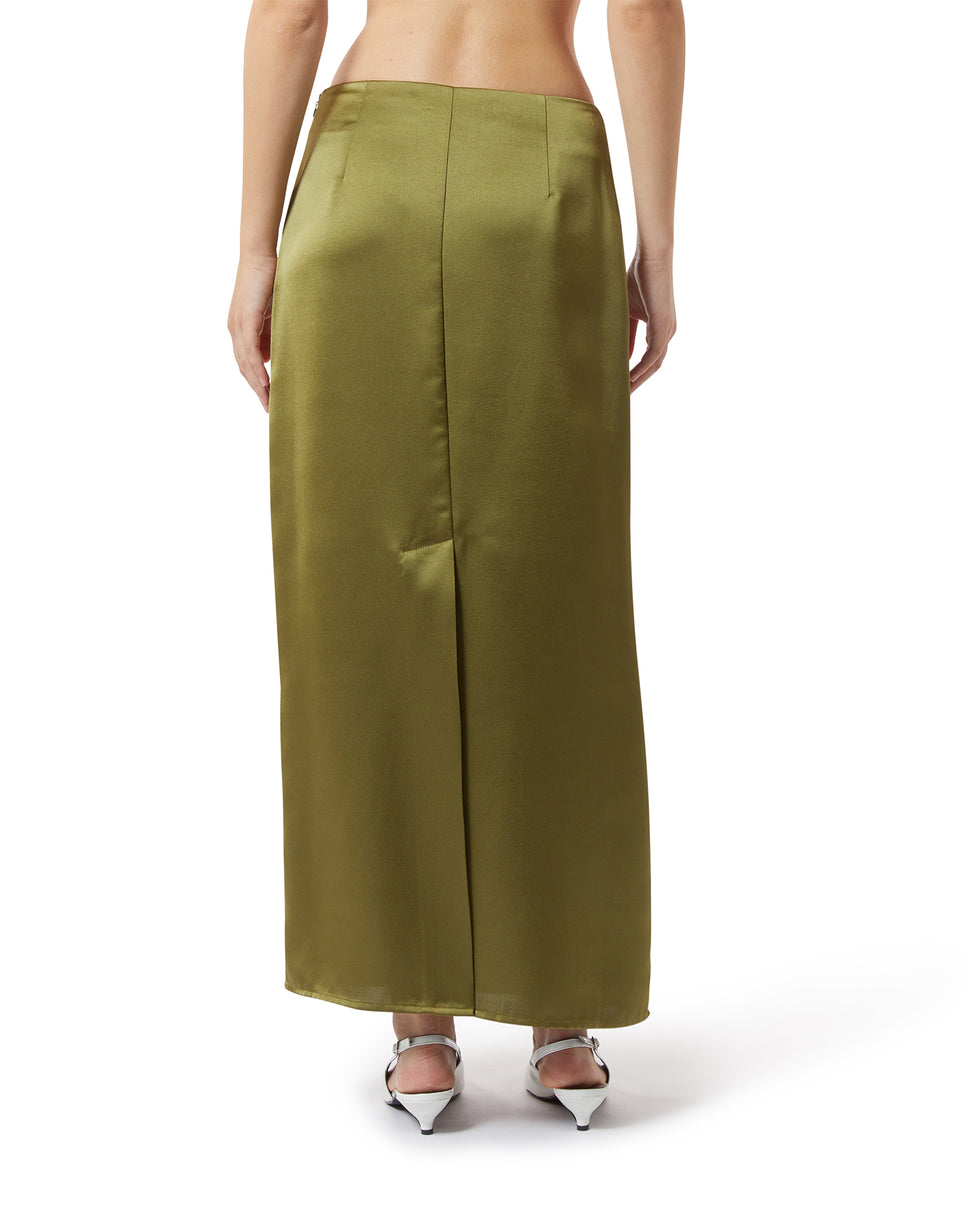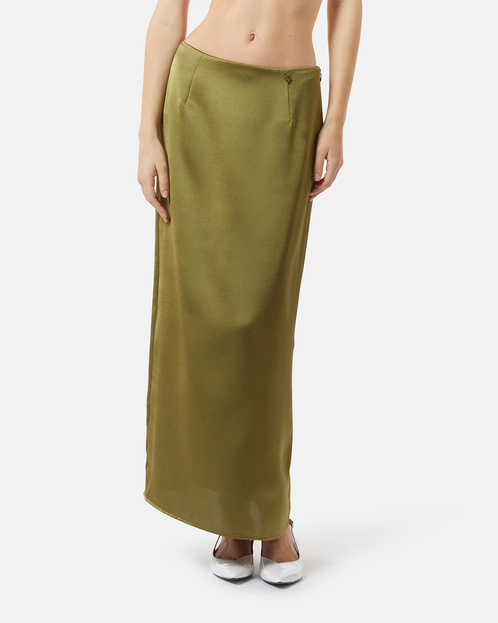 Eleganza minimalista e raffinatezza si fondono in questa gonna lunga in raso, caratterizzata da un fit scivolato e una texture luminosa. Il dettaglio gioiello sul punto vita aggiunge un tocco di esclusività, perfetto per outfit sofisticati.