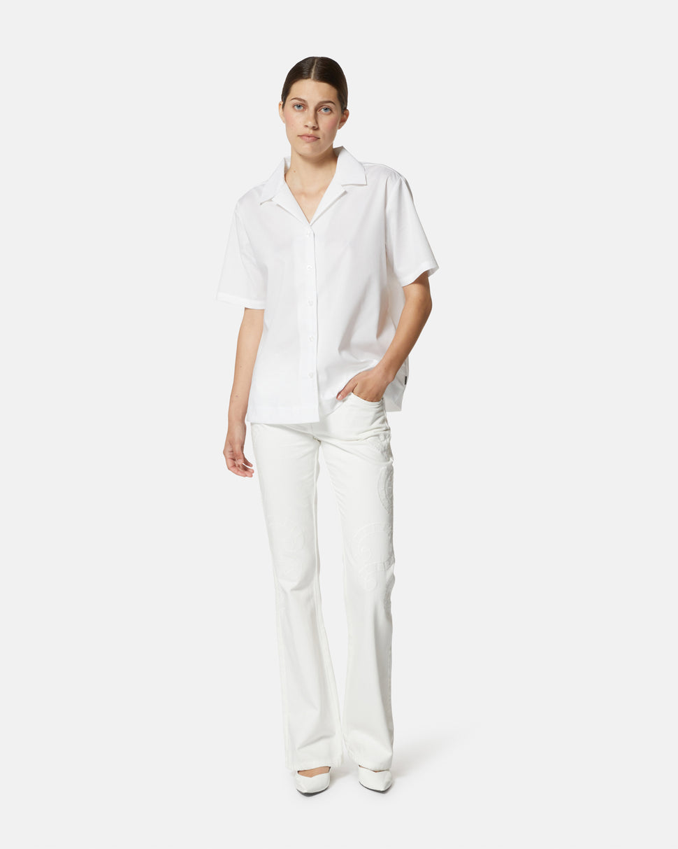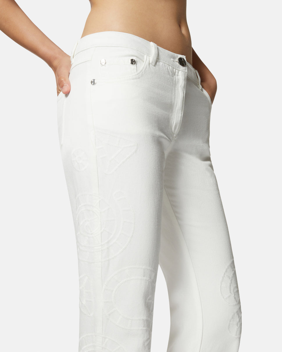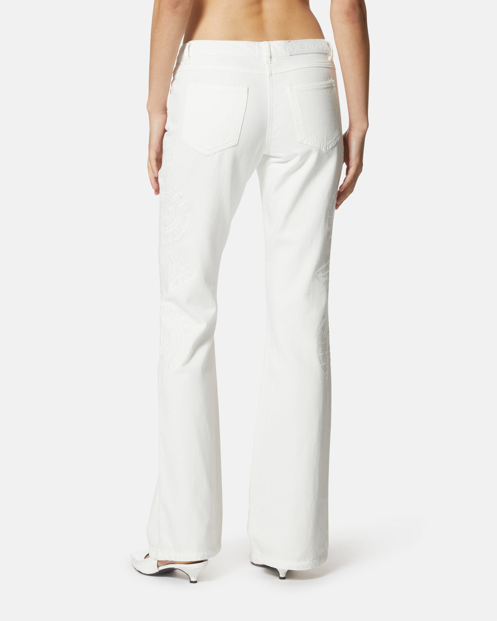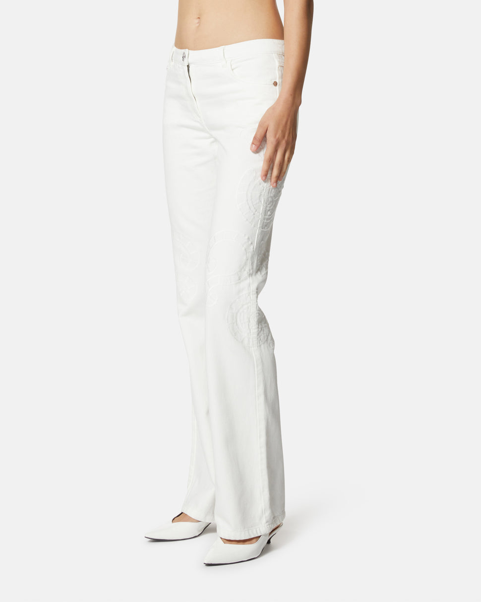 Un capo essenziale dal fascino sofisticato, questi jeans bianchi a gamba dritta sono impreziositi da ricami tono su tono che donano un tocco distintivo ed elegante. Il design classico a cinque tasche li rende versatili per ogni occasione.