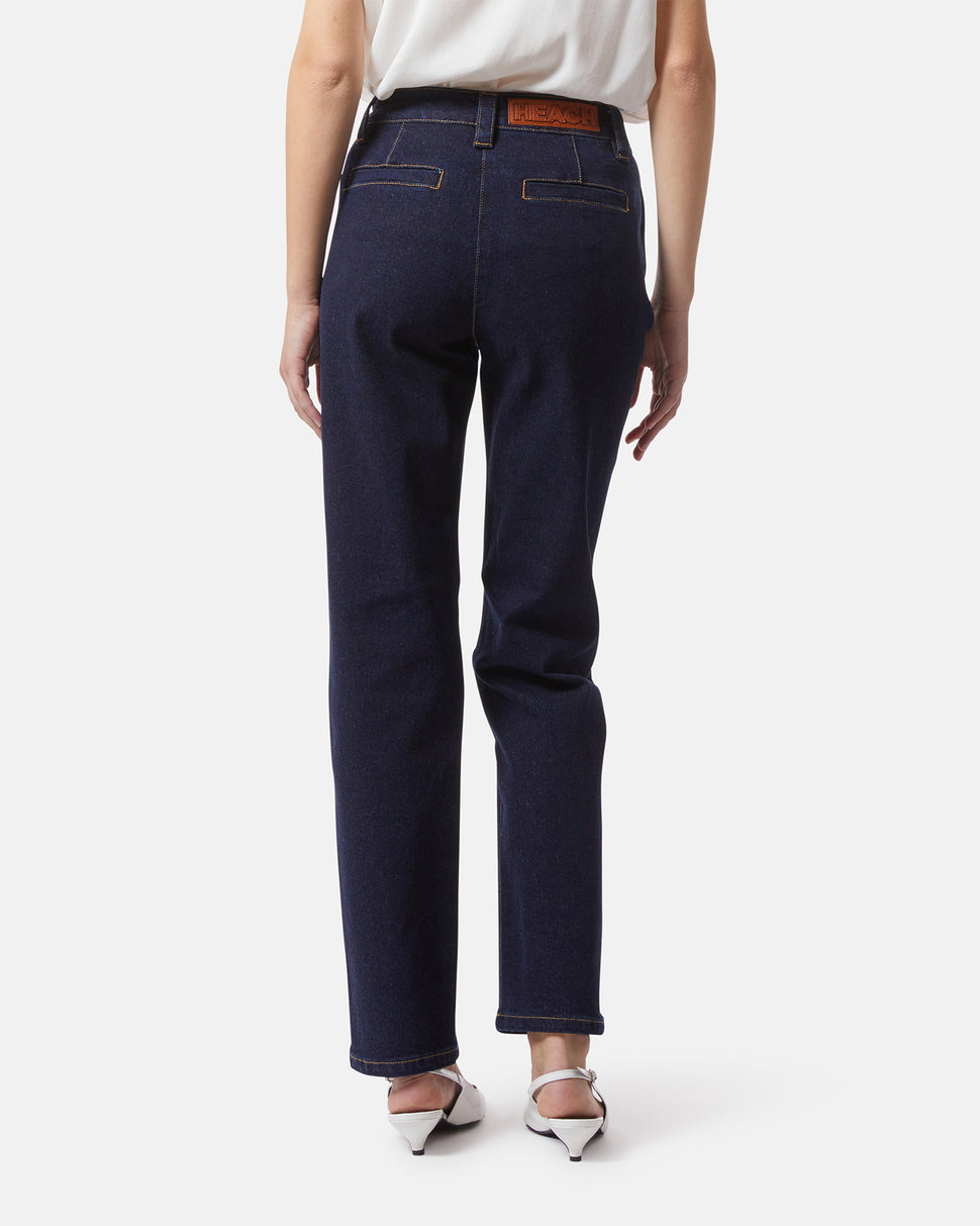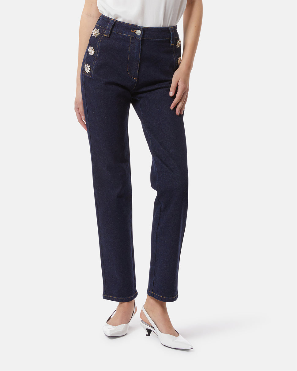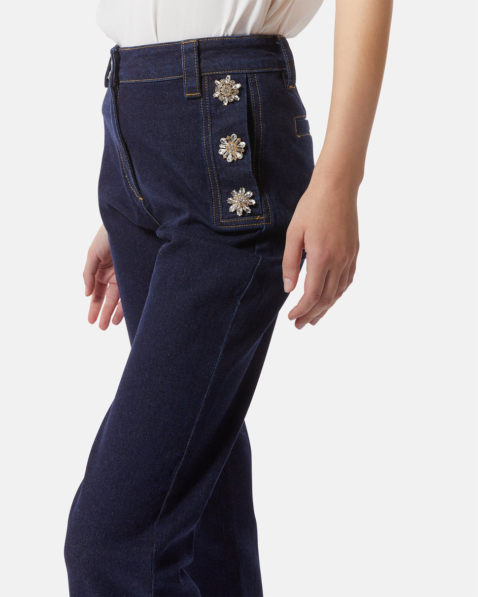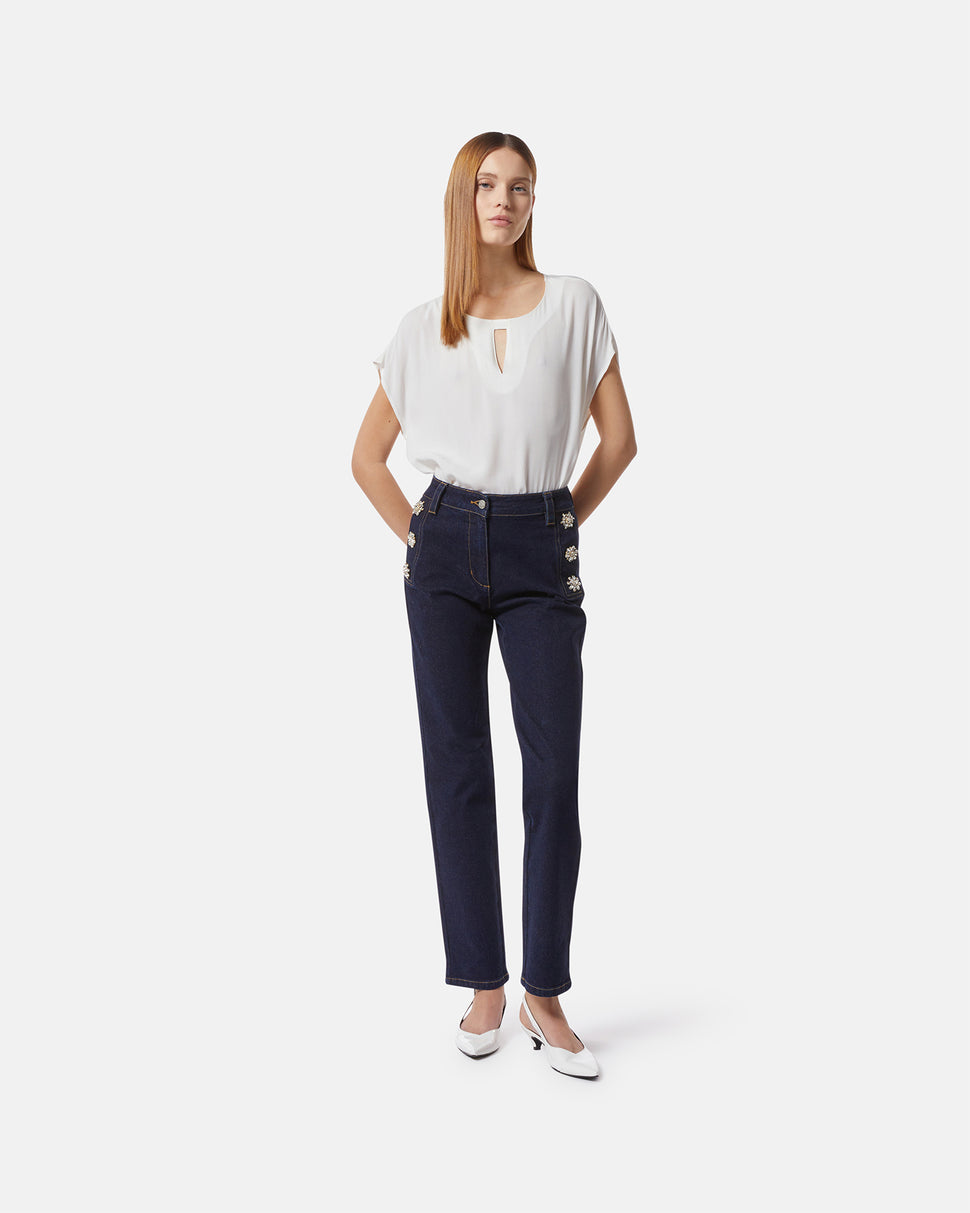 Un capo iconico dal fascino sofisticato. Questi jeans in denim scuro presentano una linea dritta e dettagli raffinati come i bottoni gioiello applicati sul lato, che donano un tocco di eleganza a un look casual. Perfetti da abbinare sia a sneakers per il giorno, sia a tacchi per un outfit più ricercato.