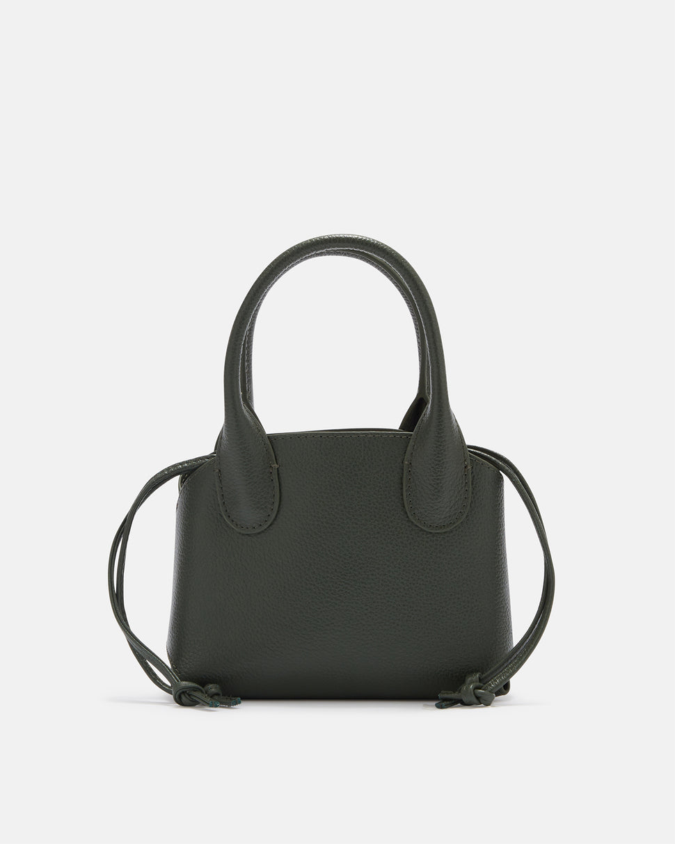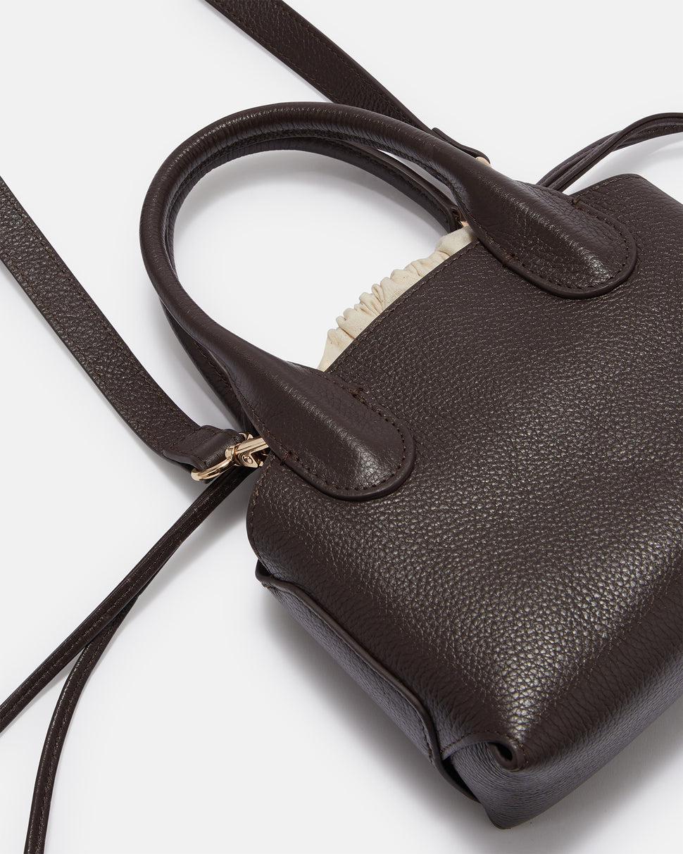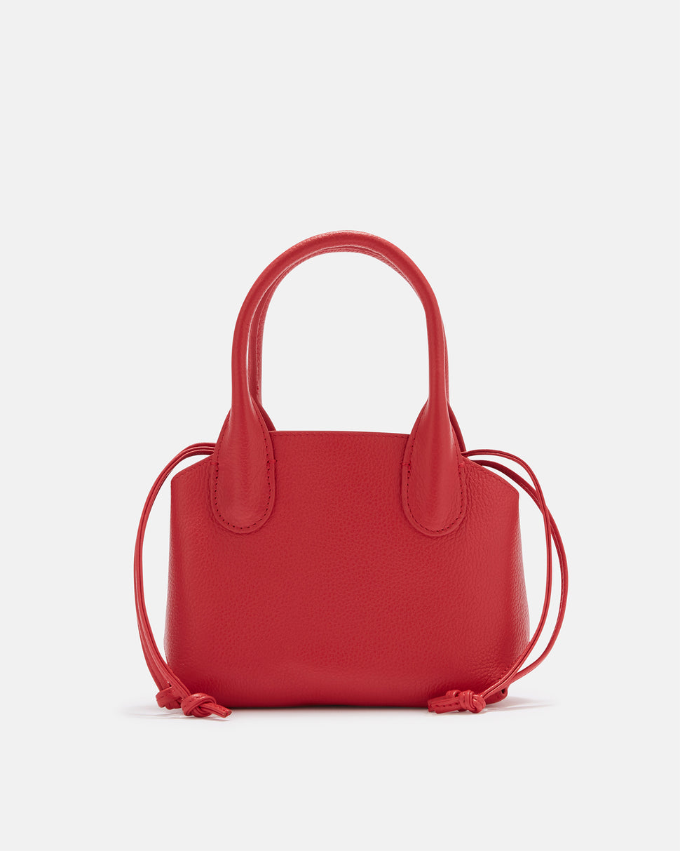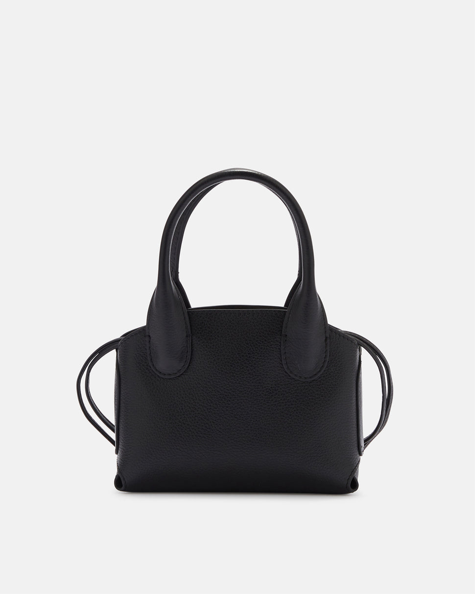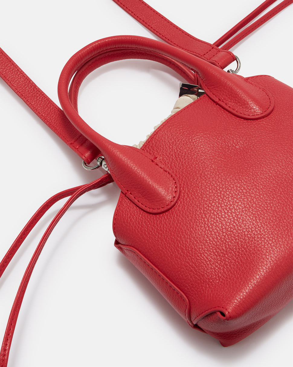 Borsa a mano rigida in pelle con sacchetto in tessuto e chiusura con coulisse.