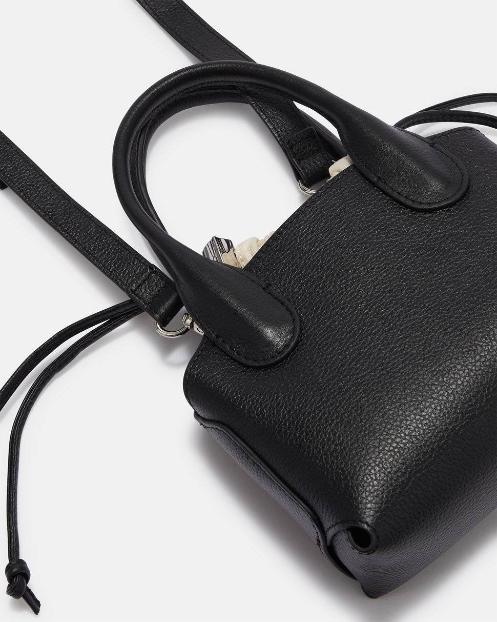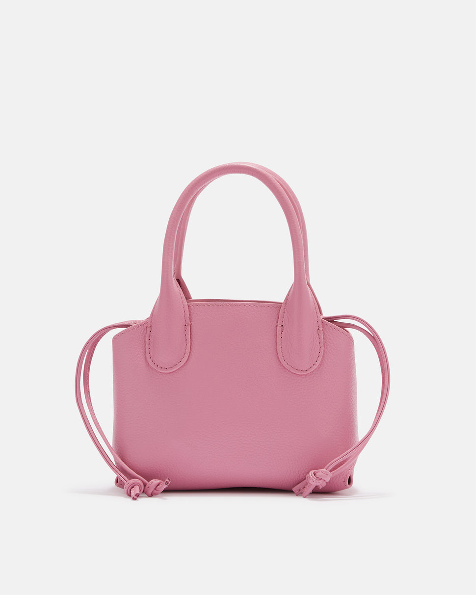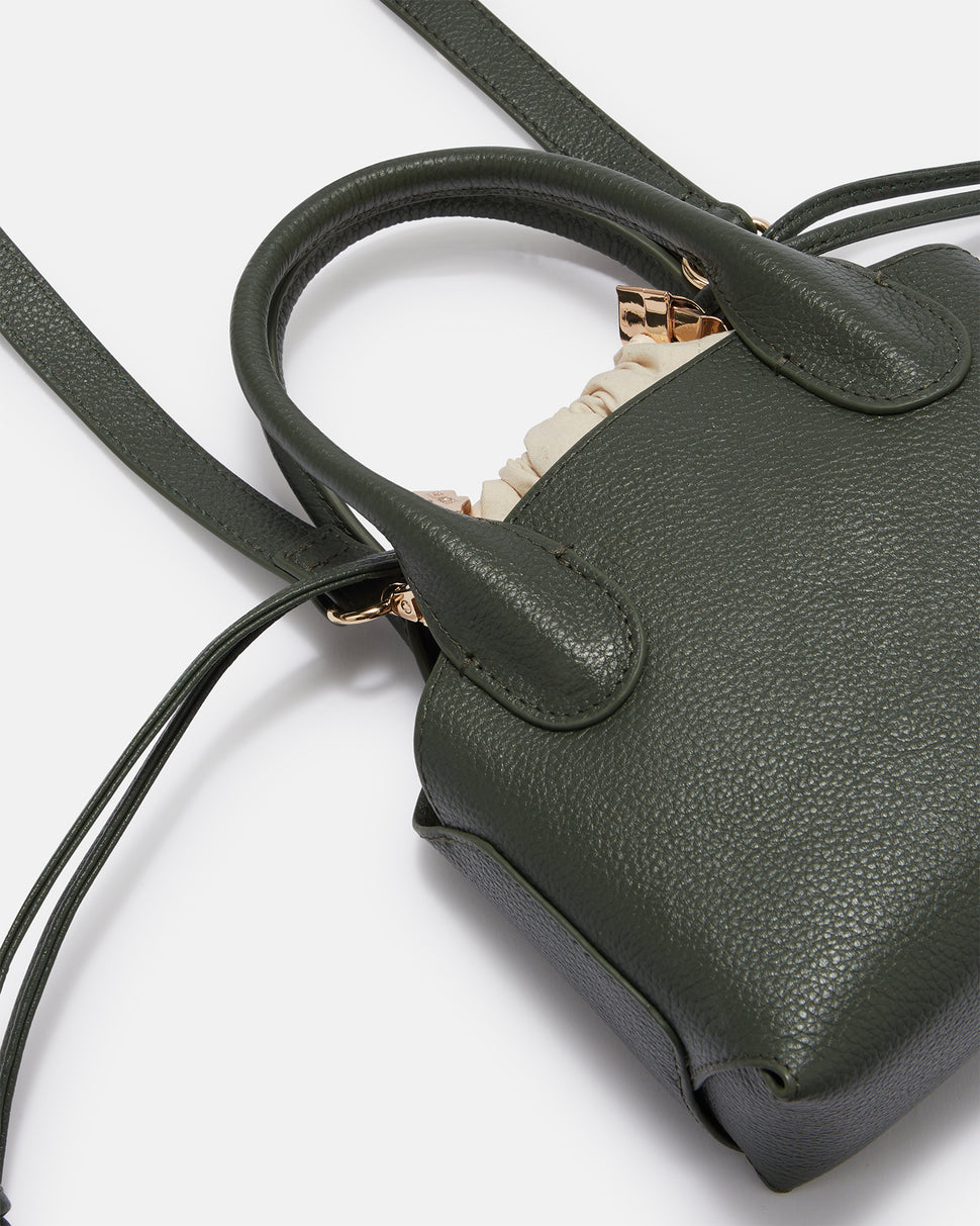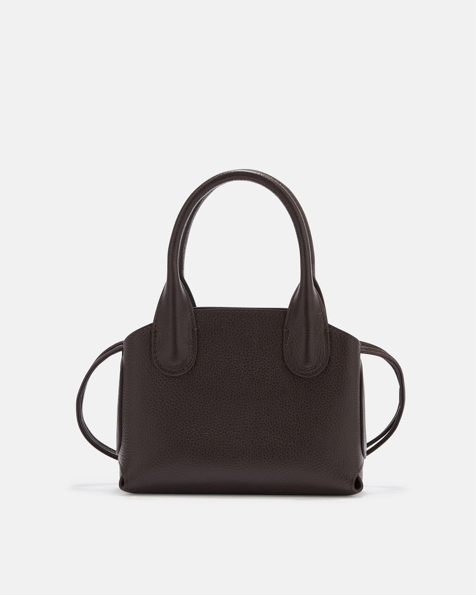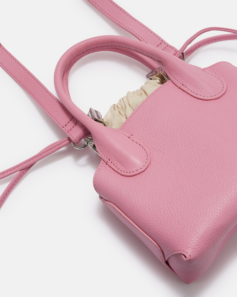 Borsa a mano rigida in pelle con sacchetto in tessuto e chiusura con coulisse.